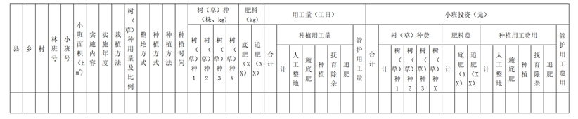 填表说明:根据方案设计的主要技术模式和措施,进行小班区划。样表仅作为参考,可根据实际建设内容进行增减、调整。表格内容应包括但不限于以下内容:统计反映各小班采取的技术模式和措施,树(草)种及用量、肥料用量、栽植(配置)方法、用工量和小班投资等内容。