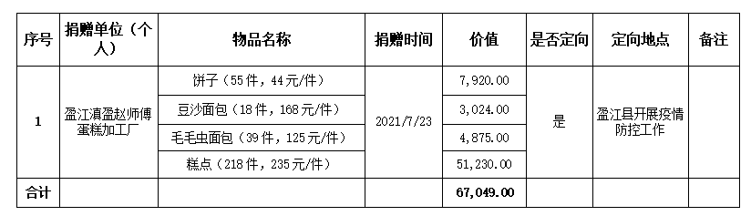 截至2021年12月1日,根据捐赠者意愿及县红十字会班子会议精神,将接收的捐赠资金253188元,除盈江县宏能电力有限公司捐赠的3万元正在办理拨款外,其余全部下拨至各受赠单位;已将接收到价值67049元的面包移交至平原镇、昔马镇、那邦镇、卡场镇、苏典乡、勐弄乡、太平镇、铜壁关乡。