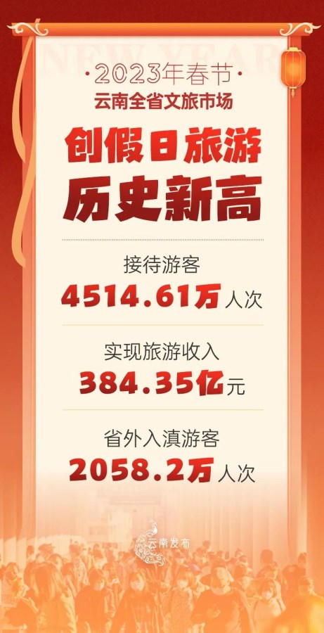 春节假日,云南全省共接待游客4514.61万人次,同比增长244.7%,实现旅游收入384.35亿元,同比增长249.4%,分别恢复至2019年的130.3%和132.5%,继去年暑期单月历史最高后,再创假日旅游历史新高。