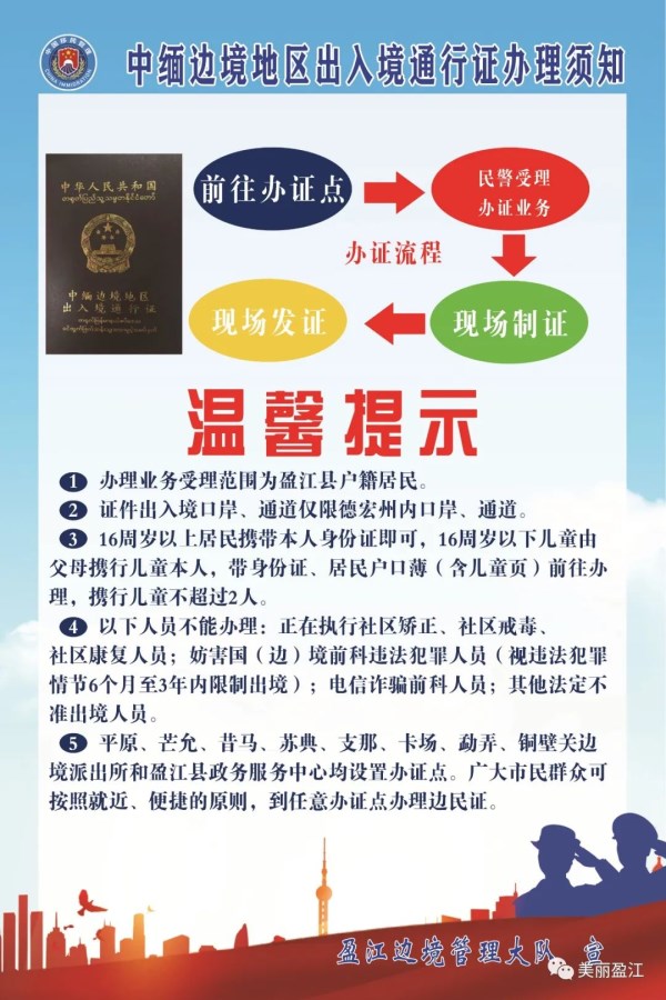 2023年1月8日,国家移民管理局恢复签发边境地区出入境通行证(简称“边民证”)。为更好的做好群众服务工作,盈江边境管理大队在平原、芒允、勐弄、昔马、支那、卡场、苏典、铜壁关8个边境派出所和盈江县政务服务中心各设1个边民证办证点。盈江县户籍居民可根据出行计划按照就近、便捷的原则到任意办证点办理边民证。