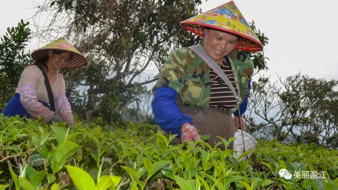 近日,盈江农场盈峰四小区的771亩茶园进入春茶采摘期。一夜春雨刚落幕,茶园里空气清新,远山云雾缭绕,茶农们身背小竹篓穿梭于茶垅间,指尖在茶树枝头如弹钢琴般轻快的跳跃着,不多时便收获一大把嫩叶装入篓中,绘制出一幅春日采茶忙的丰收画卷……