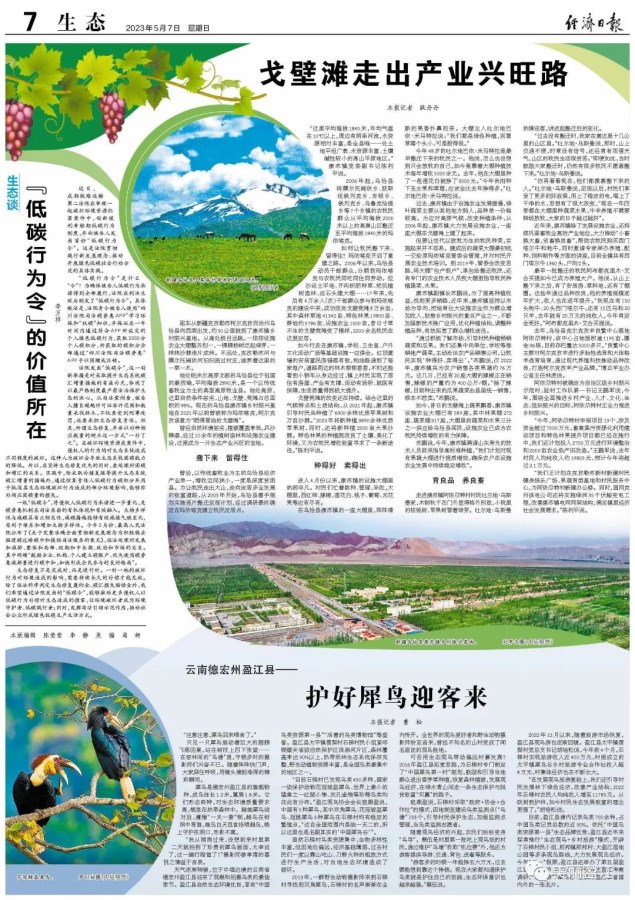 目前,盈江县境内记录鸟类700余种,占中国鸟类记录总数的近50%。依托“中国鸟类资源第一县”生态品牌优势,盈江县近年来探索推行“生态观鸟+乡村旅游”模式,开辟了石梯村民小组、那邦镇那邦村、大盈江湿地公园等多条观鸟路线,大力发展观鸟经济。今年“五一”假期,盈江县还举办了第五届盈江国际观鸟节,吸引众多专家前往盈江考察调研,“观鸟游”“犀鸟谷”正成为盈江享誉国内外的一张名片。