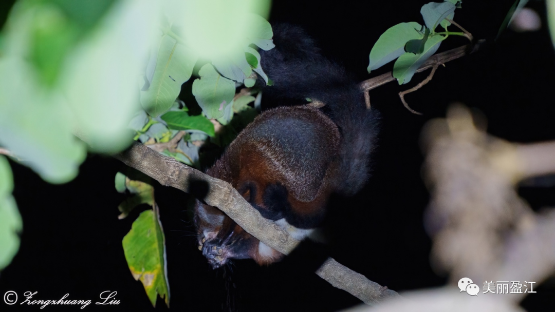 天色渐晚,我们在洪崩河简单吃过晚饭后,开始了最后的冲刺。夜色下的犀鸟谷出奇的安静,只能偶尔听到普通夜鹰机关枪一般的鸣叫,速度比起我熟悉的欧夜鹰要稍微慢些。从洪崩河往外开,我们拿出手电筒和热成像仪,开始挨个搜寻树上的猫头鹰。夜观这么多次,我还从来没有像这次一样紧张。我的手电突然照到了一个大反光点,正好停在碗口粗细的横枝上,看来是个大家伙了。我心里惊喜不已,心想这下林雕鸮稳了。不过之前听说林雕鸮的眼睛不太反光,难道是个鼯鼠?在热成像仪和手电筒的辅助下,我们慢慢找到了一个硕大的尾巴,然后看到了圆滚的身体和抱着果实的前肢——像之前几次来洪崩河一样,还是经典的云南大鼯鼠!我差点儿成了泄气皮球,但是为了队伍,还是强打着精神继续寻找。之后几次停车,要么是鼯鼠,要么是蝙蝠。