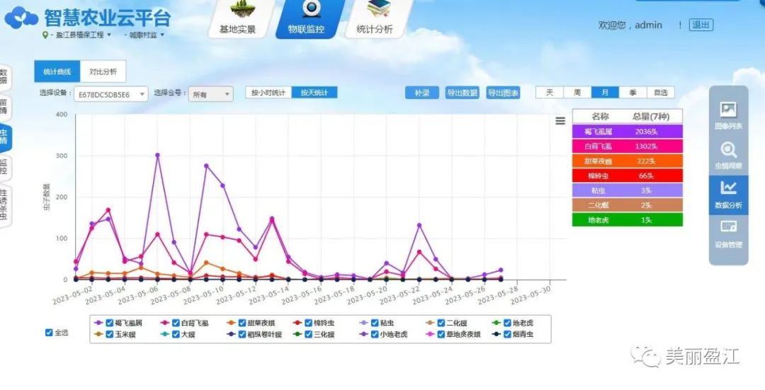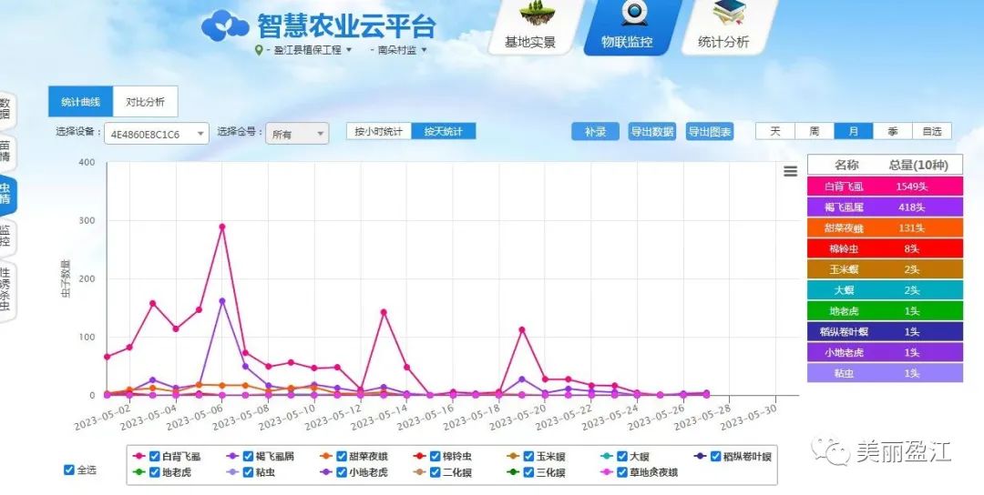 智能虫情测报系统数据显示情况。今年稻飞虱始见期在3月9日,较去年3月21日提前了12天;第一迁入高峰期4月22日,诱虫量达4632头;截至5月25日,三个自动虫情监测灯总诱虫量累计达到24589头,分别是旧城镇喊撒点8462头,弄璋镇南朵点13802头,太平镇璋西点2325头。