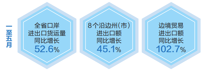 随着云南沿边州(市)营商环境的持续优化,口岸通道作用持续显现,越来越多的省内外企业通过云南口岸开展贸易,沿边地区外贸迅速升温。1至5月,云南省8个沿边州(市)进出口额453.4亿元,同比增长45.1%,占云南同期进出口总值的44.1%;文山、怒江、保山、大理、昭通5州(市)进出口总额实现高速增长,分别增长445.6%、370.6%、349%、159.3%、144.2%;临沧市进出口总额19.4亿元,同比增长16.3%;红河哈尼族彝族自治州实现进出口总额102.7亿元、增长93.5%,河口口岸累计出入境人员和进出口货物量均突破百万;西双版纳傣族自治州实现进出口总额74.4亿元、增长19.3%,磨憨铁路口岸进出口值连续10个月超越凭祥口岸,成为我国对东盟第一大铁路口岸。
