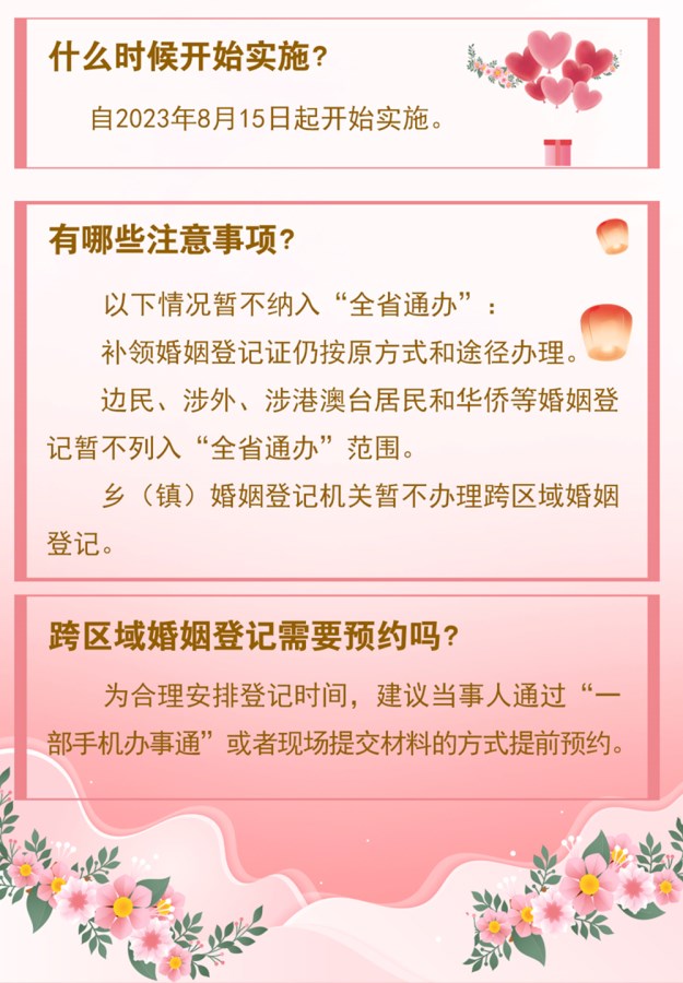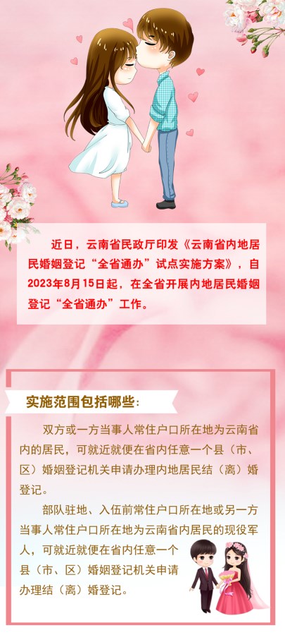 省民政厅相关负责人介绍,此项工作是省民政厅在主题教育中践行为民办实事的务实举措。2022年,我省已在昆明、玉溪、红河、大理等4个州(市)开展州(市)内跨区域结婚通办试点,截至2023年5月,全省所有州(市)均已实现结婚登记州(市)内通办。