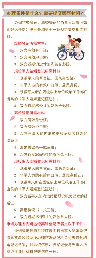 申请办理省内跨区域离婚登记应满足婚姻登记信息系统可查询到当事人结婚登记信息或者经联系原办理结婚登记机关可查询到结婚登记档案,且系统信息、档案记录与当事人所持证件证明材料记载信息一致条件。补领婚姻登记证仍按原方式和渠道办理。边民、涉外、涉港澳台居民和华侨等婚姻登记暂不列入“全省通办”范围。乡(镇)婚姻登记机关暂不办理跨区域婚姻登记。