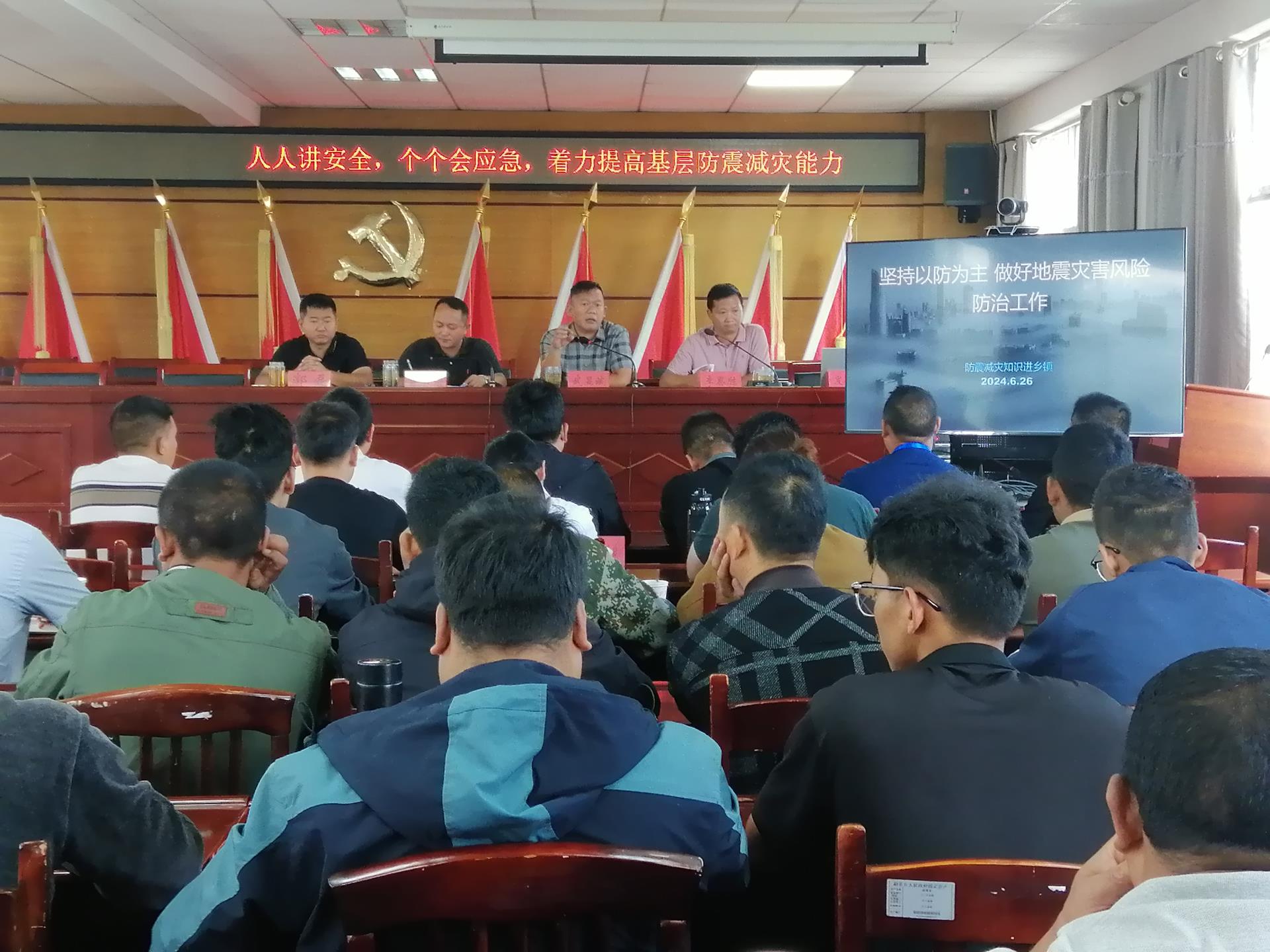 6月26日,根据盈江县抗震救灾指挥部安排,盈江县应急管理局、县防震减灾局、县卫生健康局、县消防救援大队围绕“人人讲安全,个个会应急,着力提高基层防震减灾能力”的主题,通过“3+模式”(即:地震科普知识+专业技能+实战演练)在勐弄乡推进片区地震应急“第一响应人”培训,县应急管理局局长武显斌、县防震减灾局局长李恩胜,勐弄乡党委书记董书荣、乡长郭磊,卡场镇、苏典乡、勐弄乡3乡镇分管副乡镇长、防震减灾助理员、3乡镇行政村干部等55人参加培训,会议由勐弄乡党委书记董书荣主持。