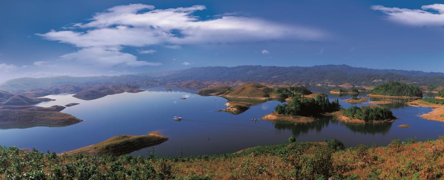 凯邦亚湖位于县城西南40公里处,介于县城至那邦镇途中。凯邦亚,景颇语,意为收获之谷。8平方公里水面,深藏于崇山峻岭之中。水面迂回曲折,近百个岛屿及无数半岛,看似岛岛相连,其实岛后有岛,岛水相间,仿佛蓬莱仙境。明镜般的湖面,时有水鸟飞行,或是栖于水中林木之上,更显出宁静和高雅。年平均气温为14.2℃,是一座难得的“凉库”,实为回归自然,休闲度假之胜地。多彩的山地民族风情更增添了景区的民族文化内涵。山地自然风光和山地民族风情,是一处难得的山地民族文化生态园。目前已进行初期开发,并对游人开放,属国家A级景区。