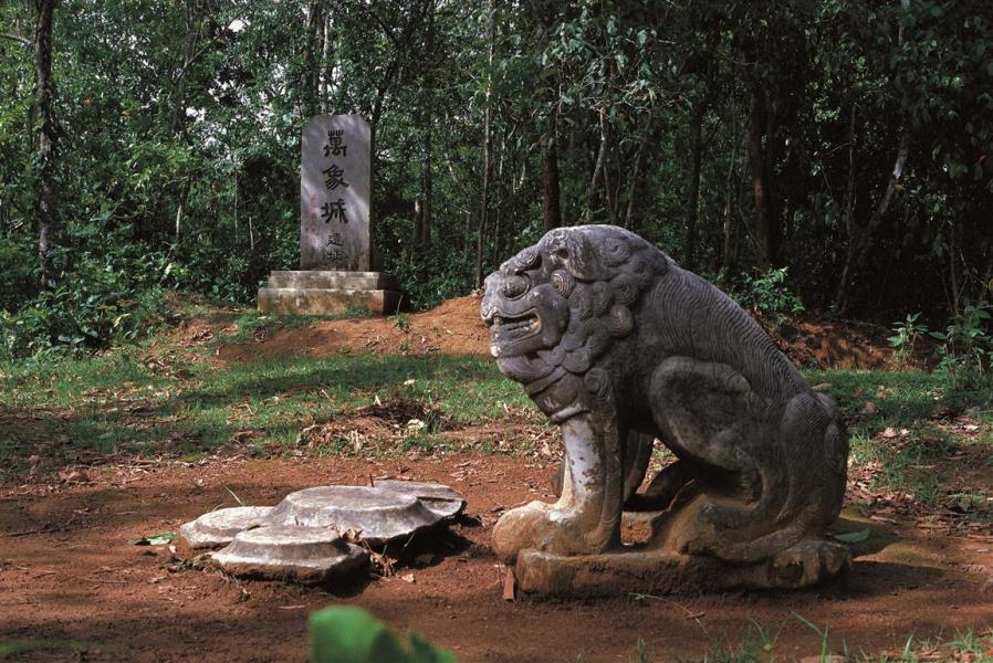 万象城遗址在今盈江县弄璋乡老闷掌寨,傣语称“姐闷掌”,意为万象城。为干崖土司第十任至十三任宣抚使驻地。万历十二年(1584),刀怕宣袭职时,选择在大象多的弄璋重建司署,传说当时弄璋共有9999头大象。为求吉祥如意。司署建起后,用纸裱糊了一头大象,将大象总数凑成一万,而得名万象城。据载,此城建起后十分繁荣,仅街道就有7条,还辟有占地数亩的御用花园。清顺治十六年(1659),南明永历皇帝逃缅途经盈江,曾留宿万象城。康熙三十一年(1692),被战火焚毁。从建至毁历时107年。今遗址尚有完整石狮一对,司署花园废墟尚存。1987年,盈江县人民政府于该地立“万象城遗址”石碑一方。