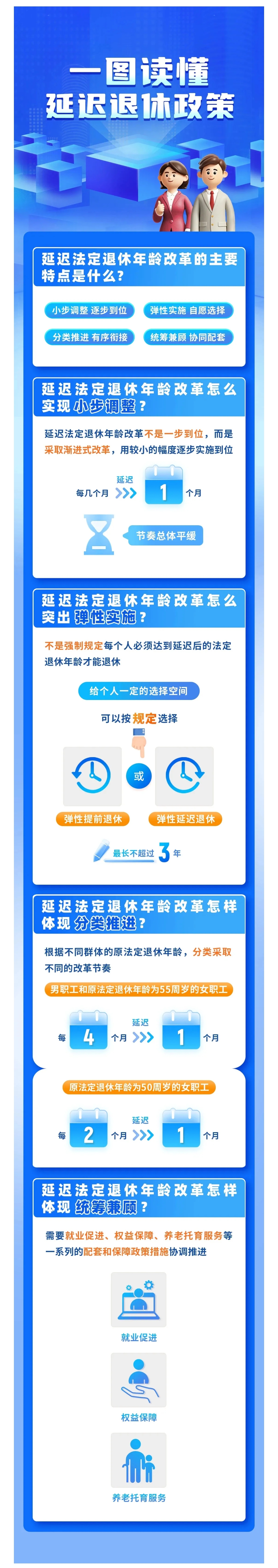 这是职工法定退休年龄自上世纪50年代确定后,70多年来首次进行调整。除延迟法定退休年龄外,决定将调整职工按月领取基本养老金最低缴费年限,从2030年起由15年逐步提高至20年,每年提高6个月。在统一实施延迟退休基础上,决定允许职工达到最低缴费年限,可以自愿选择弹性提前退休,提前时间最长不超过3年,且退休年龄不得低于原法定退休年龄;也可以在单位与职工协商一致的前提下弹性延迟退休,延迟时间最长不超过3年。延迟退休改革是一项系统工程。针对公众高度关切的民生问题,决定同时明确了健全养老保险激励机制、实施就业优先战略、保障超过法定退休年龄劳动者基本权益、健全养老托育服务体系等。决定还就大龄失业人员保障和特殊工种等提前退休作出专门规定。党的二十大和二十届三中全会就实施渐进式延迟法定退休年龄作出明确部署。此次出台的方案是在综合考虑我国人均预期寿命、健康水平、人口结构、国民受教育程度、劳动力供给等因素基础上研究制定的。盈江县人力资源和社会保障局职工养老保险中心、退休办理咨询电话:0692—8969893 0692-8118407