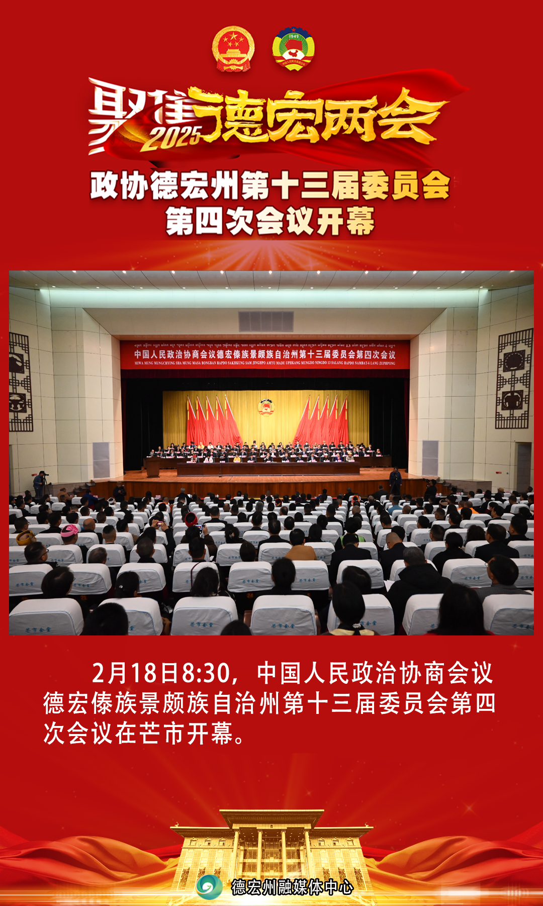 2月18日8:30,中国人民政治协商会议德宏傣族景颇族自治州第十三届委员会第四次会议在芒市开幕。