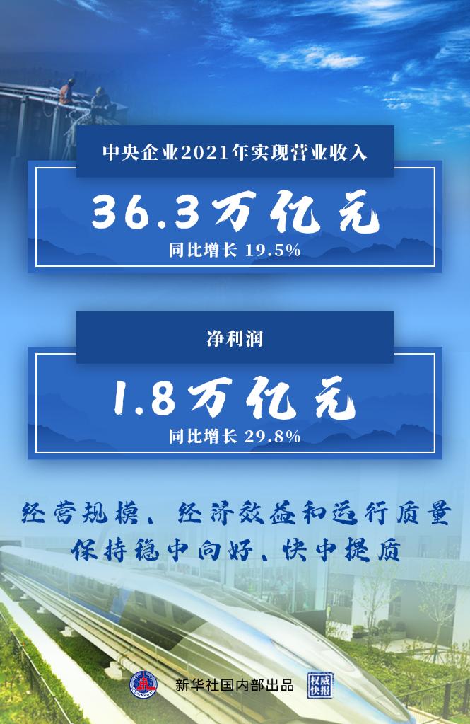 新华社北京1月19日电(记者王希)中央企业2021年经济运行成绩单19日“出炉”:全年实现营业收入36.3万亿元,同比增长19.5%,两年平均增长8.2%;实现利润总额2.4万亿元、净利润1.8万亿元,分别同比增长30.3%、29.8%,两年平均增速分别为14.5%、15.3%。