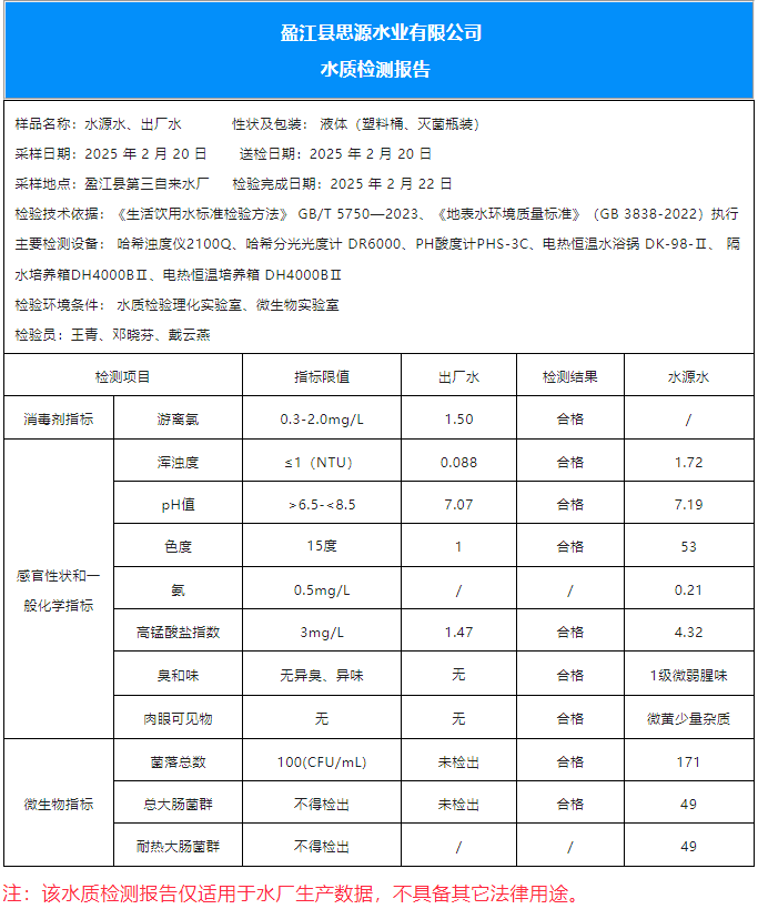 2025年2月20日盈江县第三自来水厂《水质检测报告》