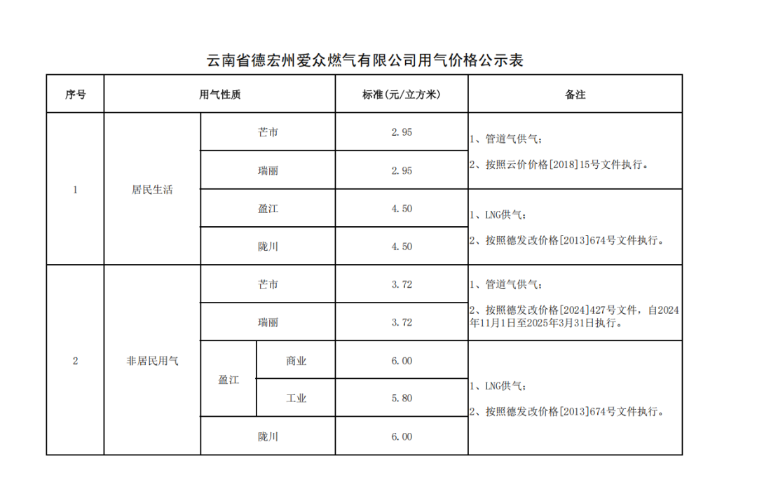 德宏州城区“采暖季”用气价格公示