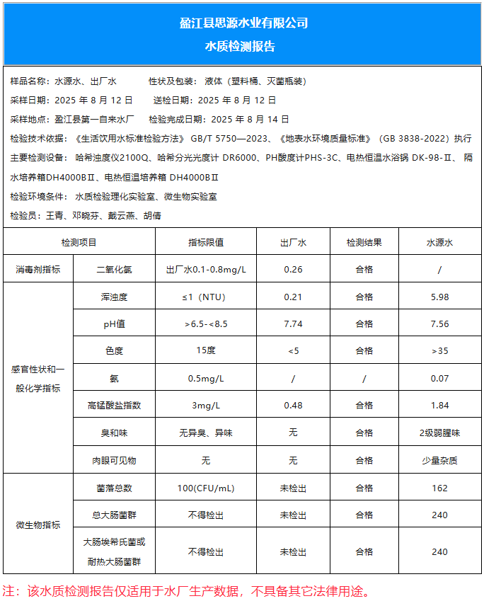 2025年8月12日盈江县第一自来水厂《水质检测报告》