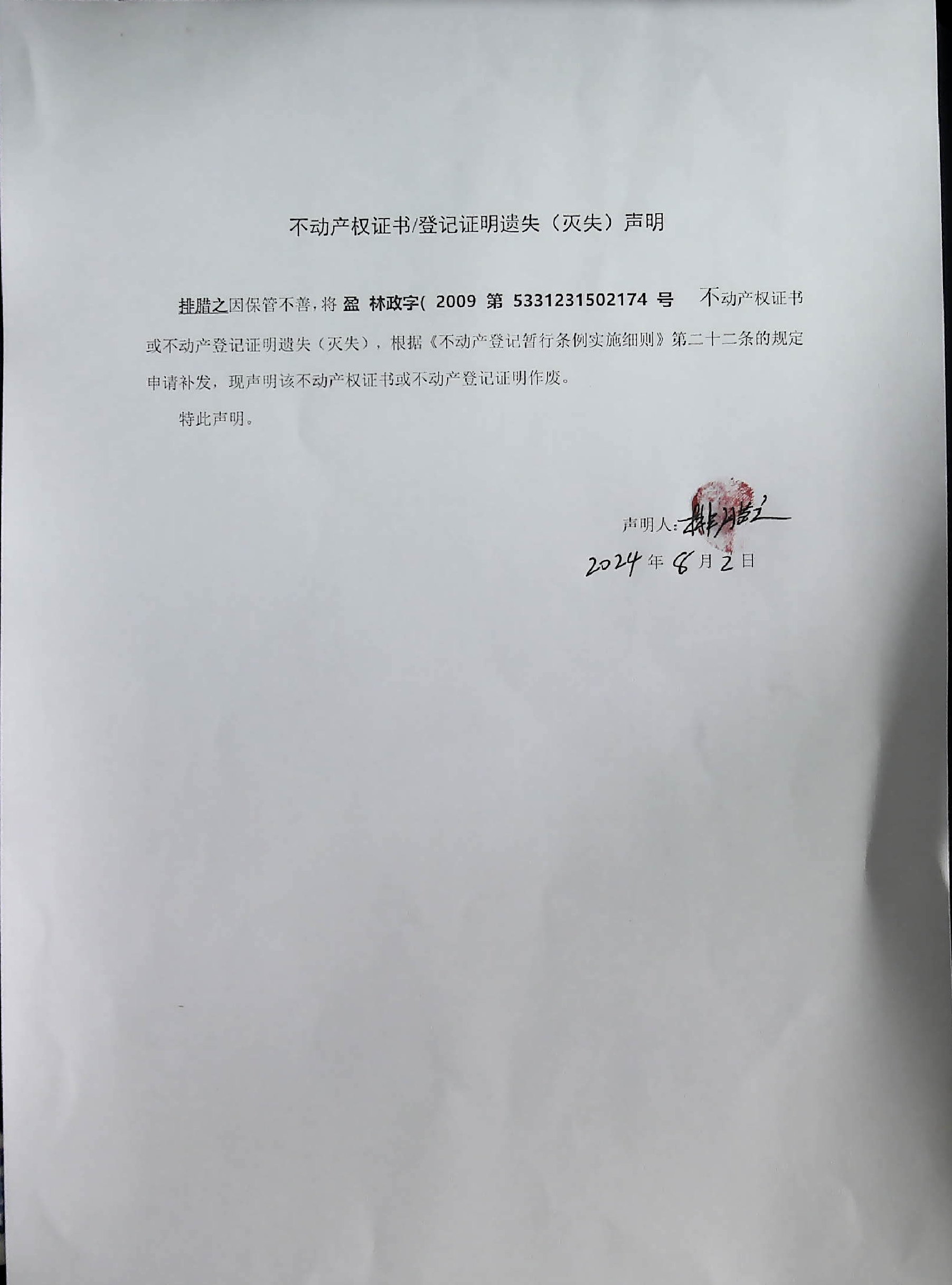 不动产权证书/登记证明遗失(灭失)声明(排腊之)