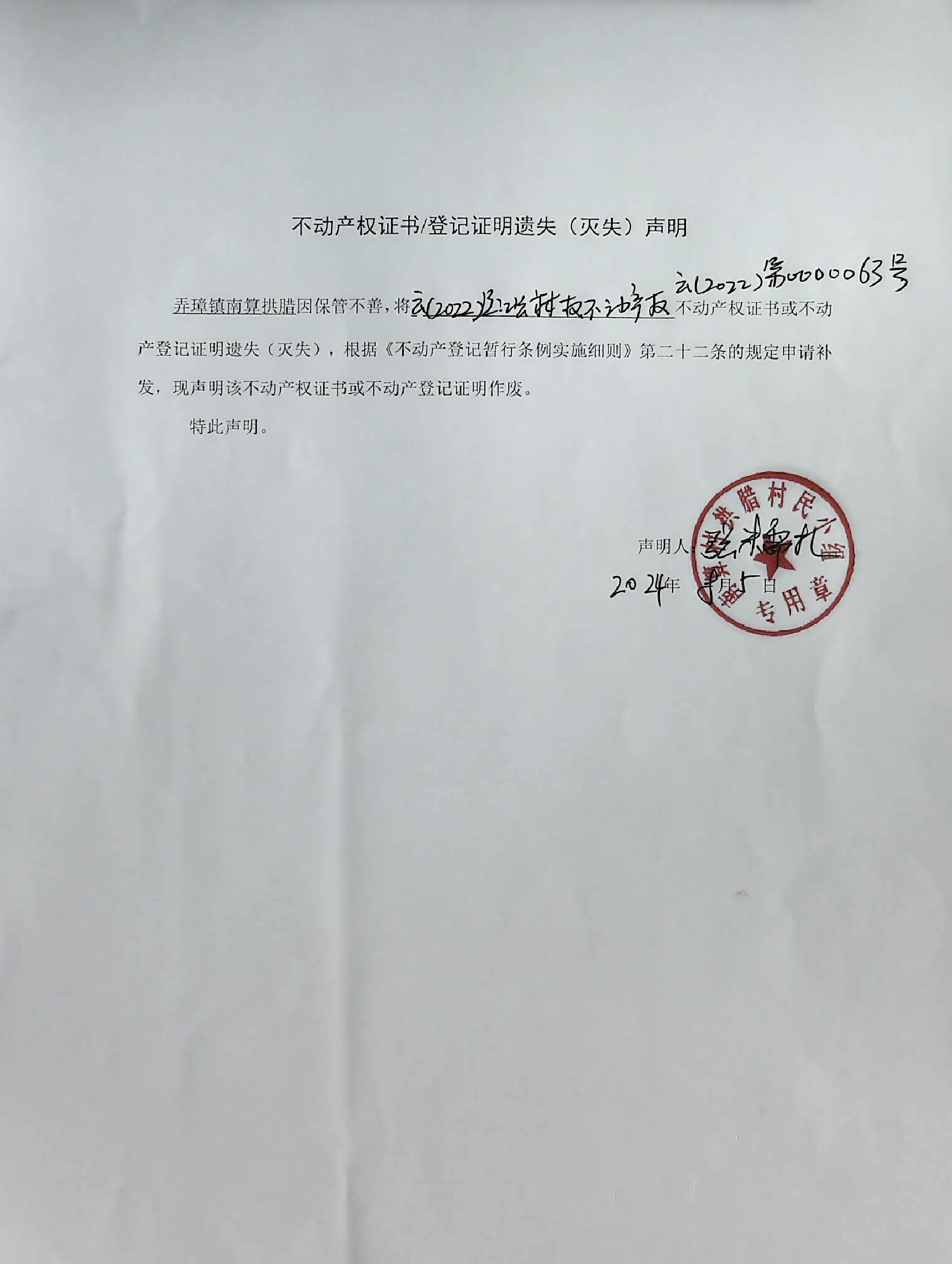不动产权证书/登记证明遗失(灭失)声明(弄璋镇南算拱腊)
