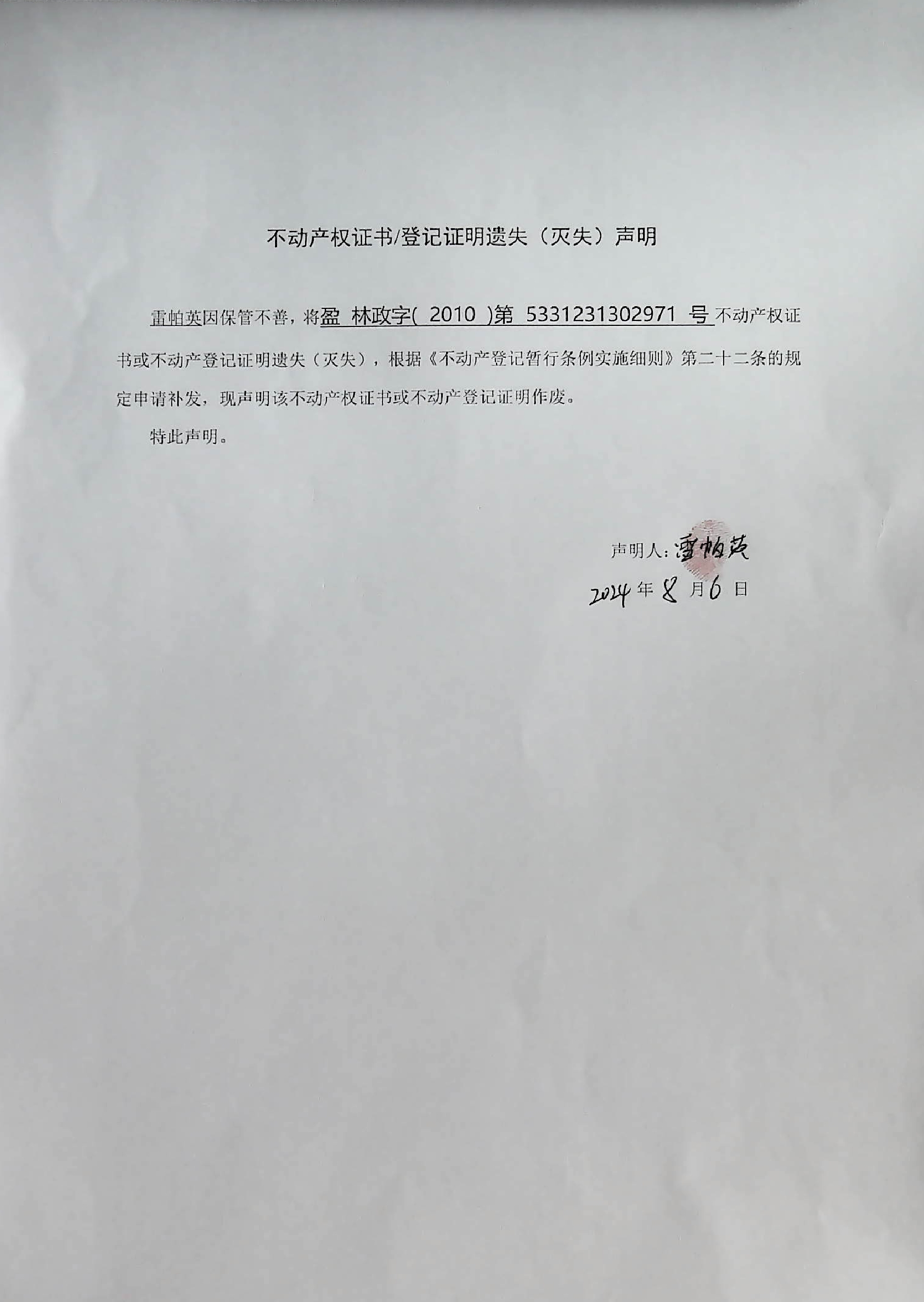 不动产权证书/登记证明遗失(灭失)声明(雷帕英)