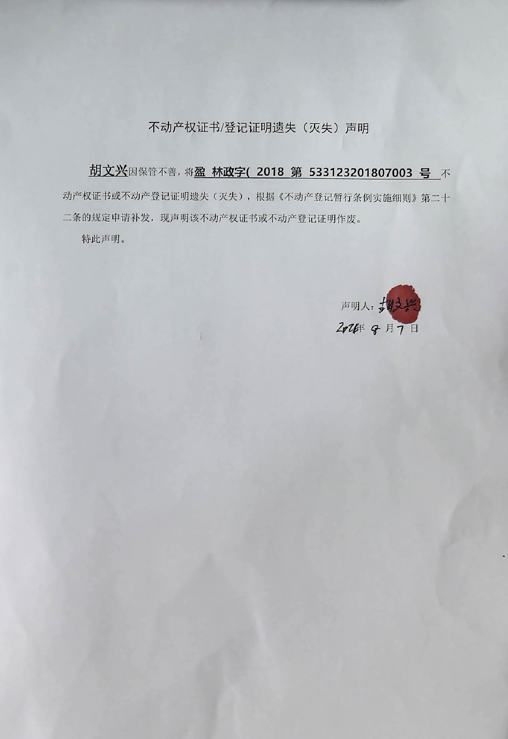 不动产权证书/登记证明遗失(灭失)声明(胡文兴)