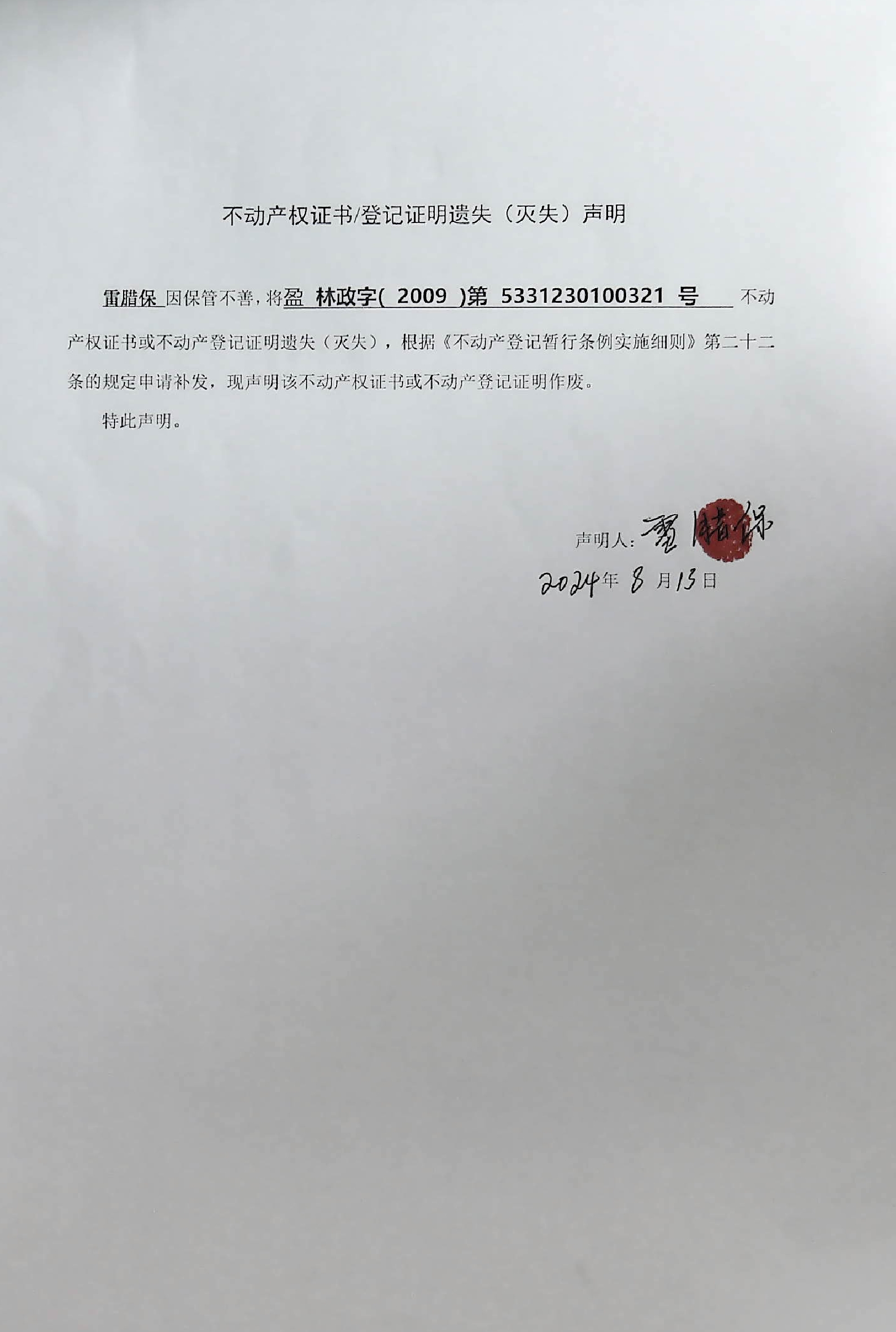 不动产权证书/登记证明遗失(灭失)声明(雷腊保)