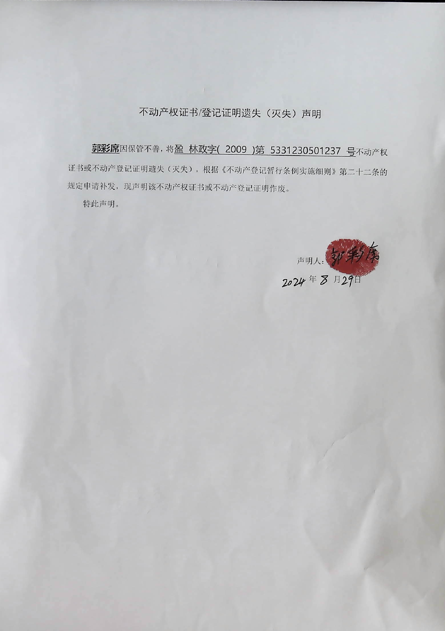 不动产权证书/登记证明遗失(灭失)声明(郭彩席)