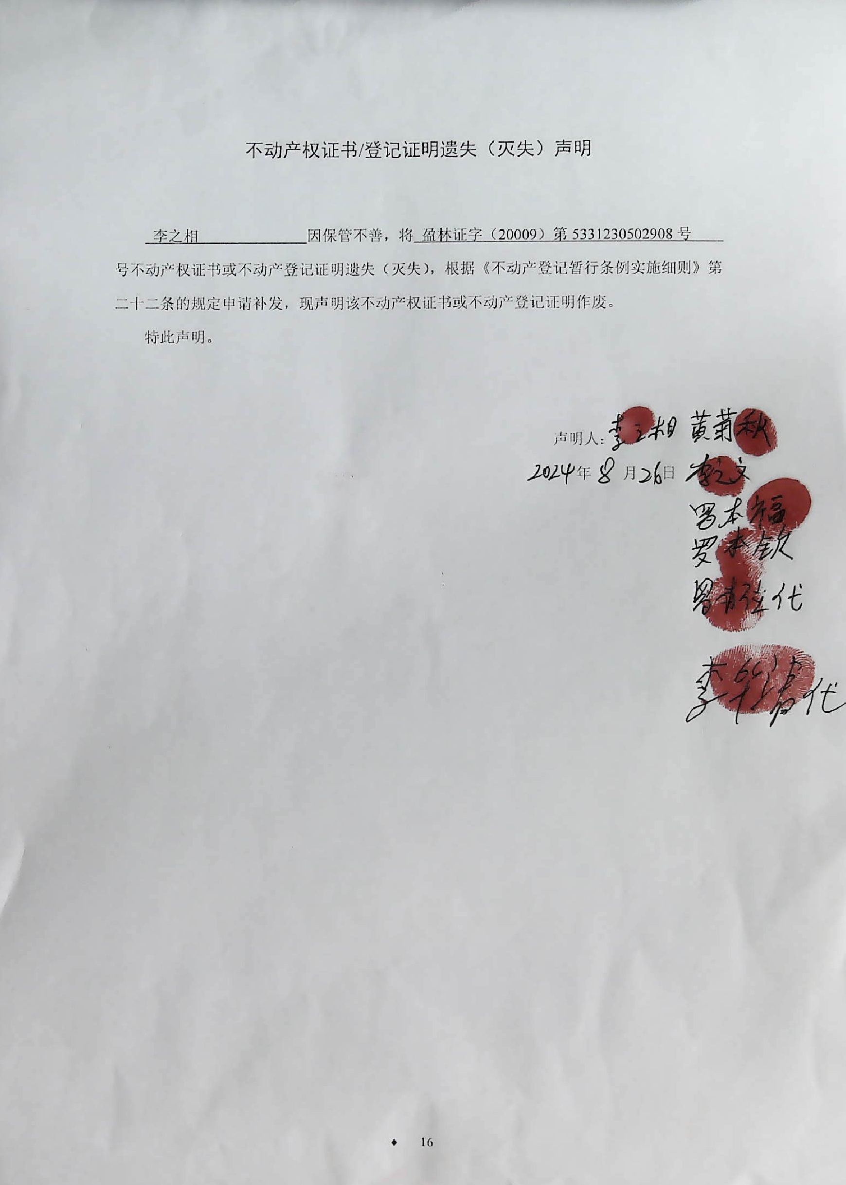 不动产权证书/登记证明遗失(灭失)声明(李之相)