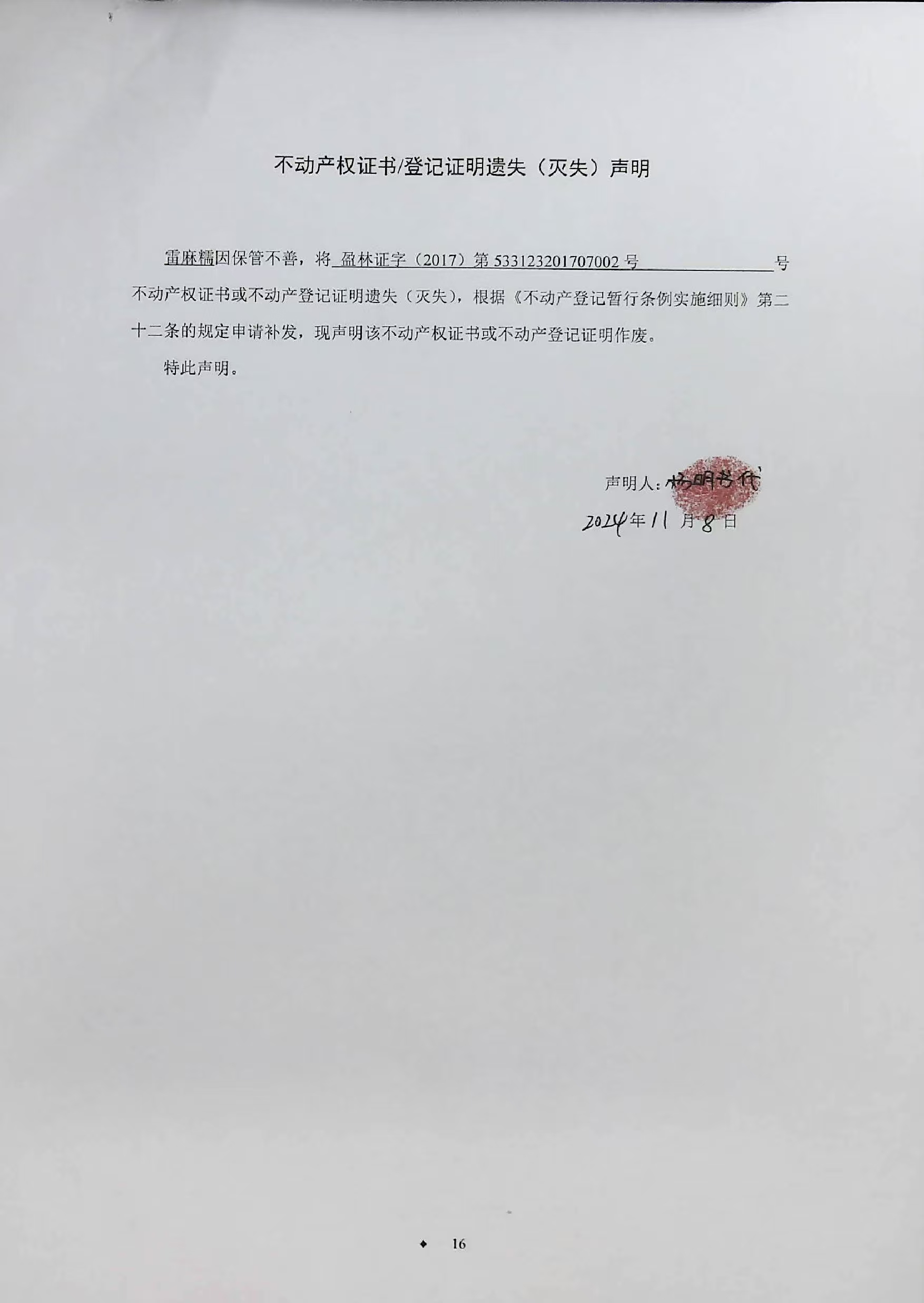 不动产权证书/登记证明遗失(灭失)声明(雷麻糯)