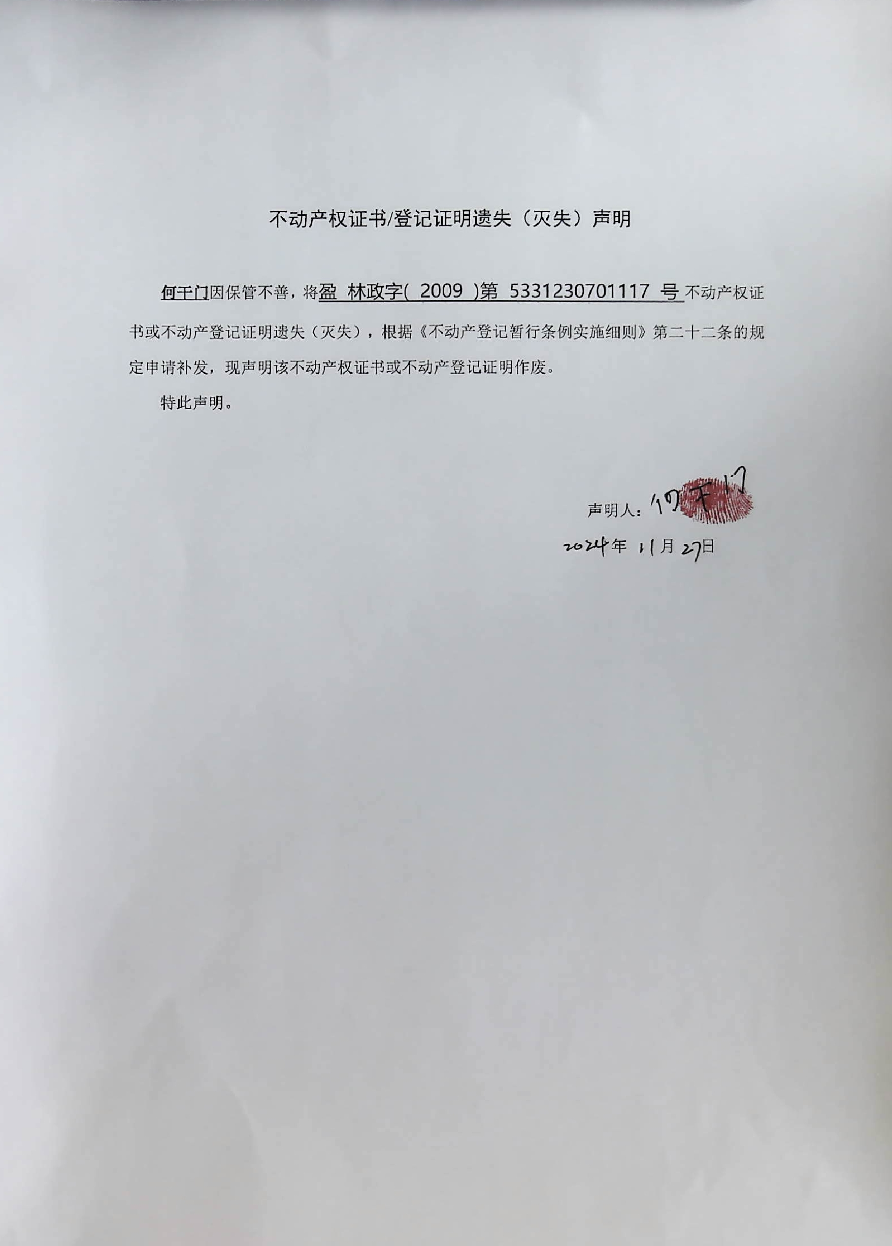 不动产权证书/登记证明遗失(灭失)声明(何干门)