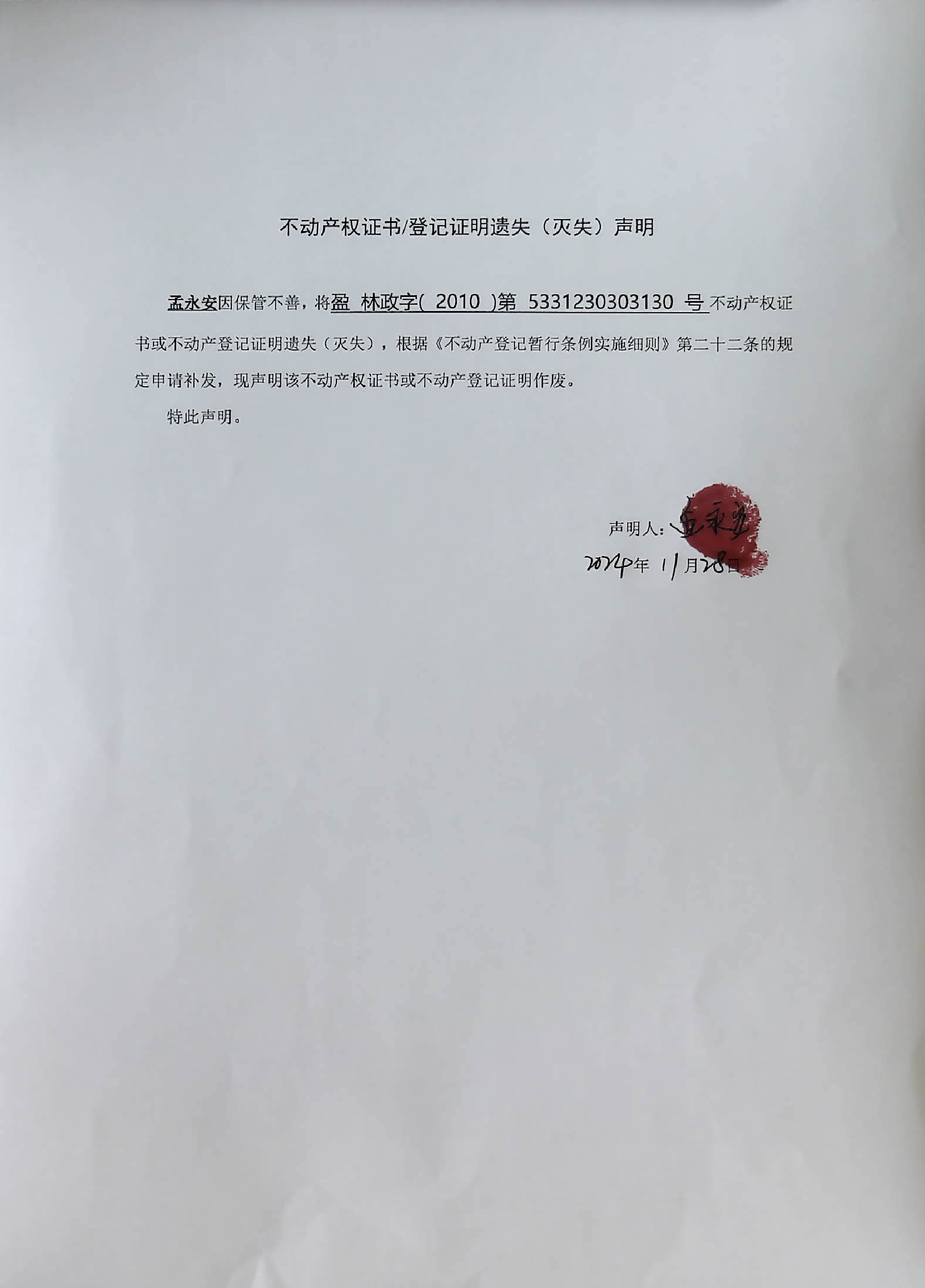 不动产权证书/登记证明遗失(灭失)声明(孟永安)