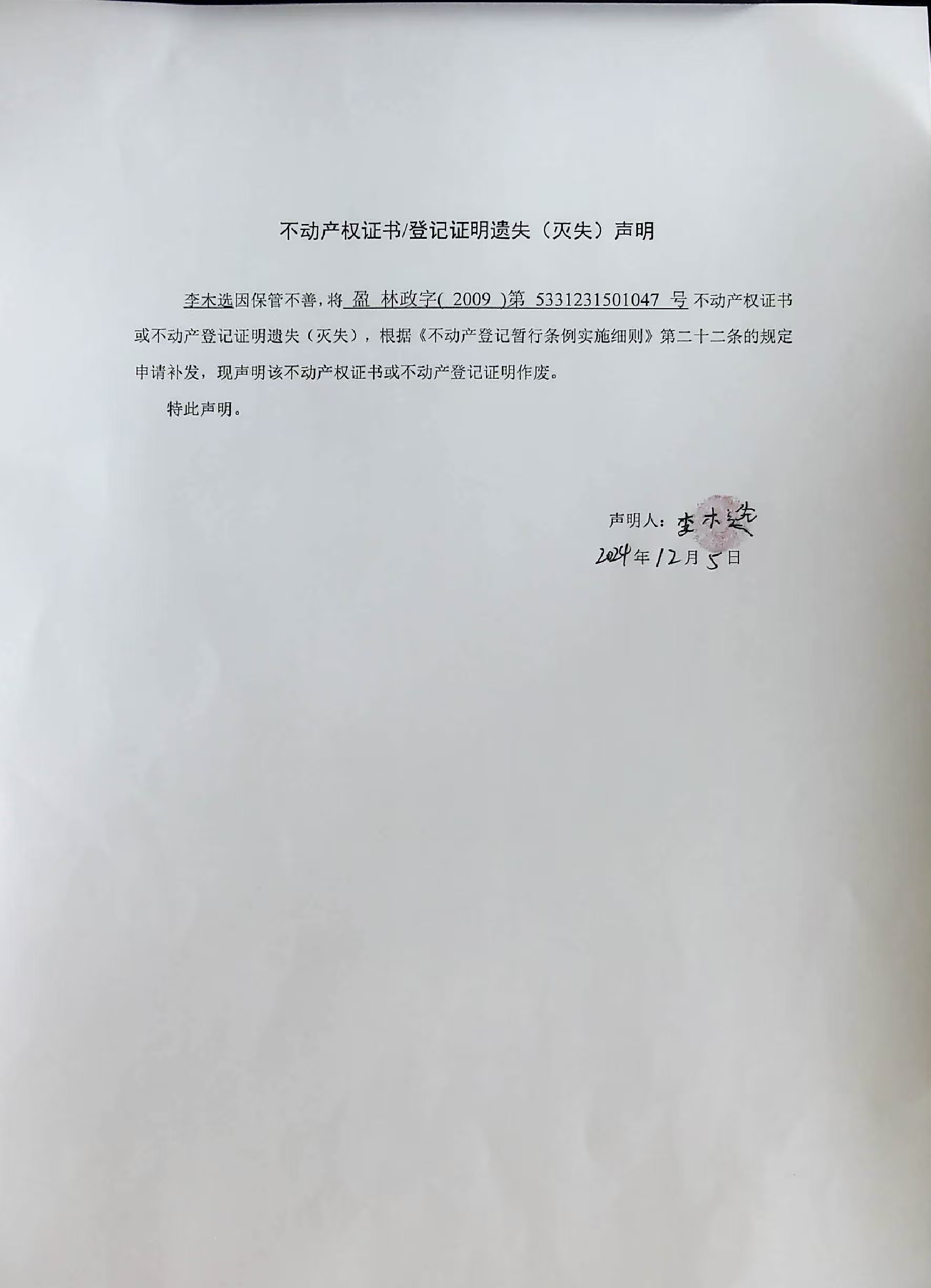 不动产权证书/登记证明遗失(灭失)声明(李木选)