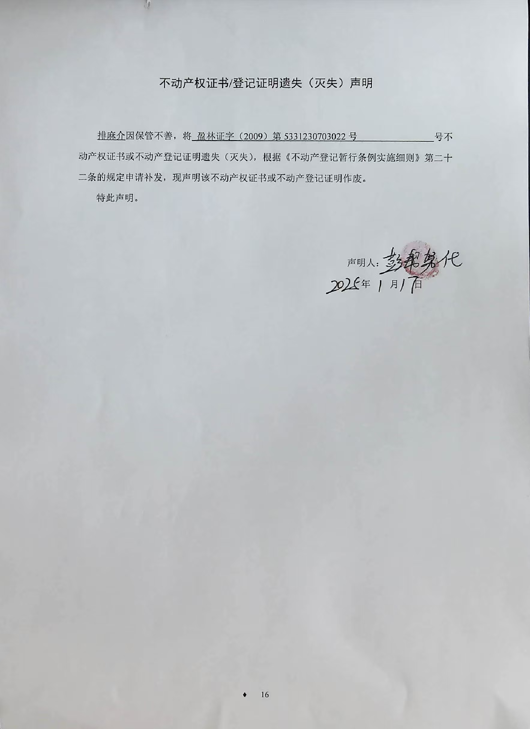 不动产权证书/登记证明遗失(灭失)声明(排麻介)