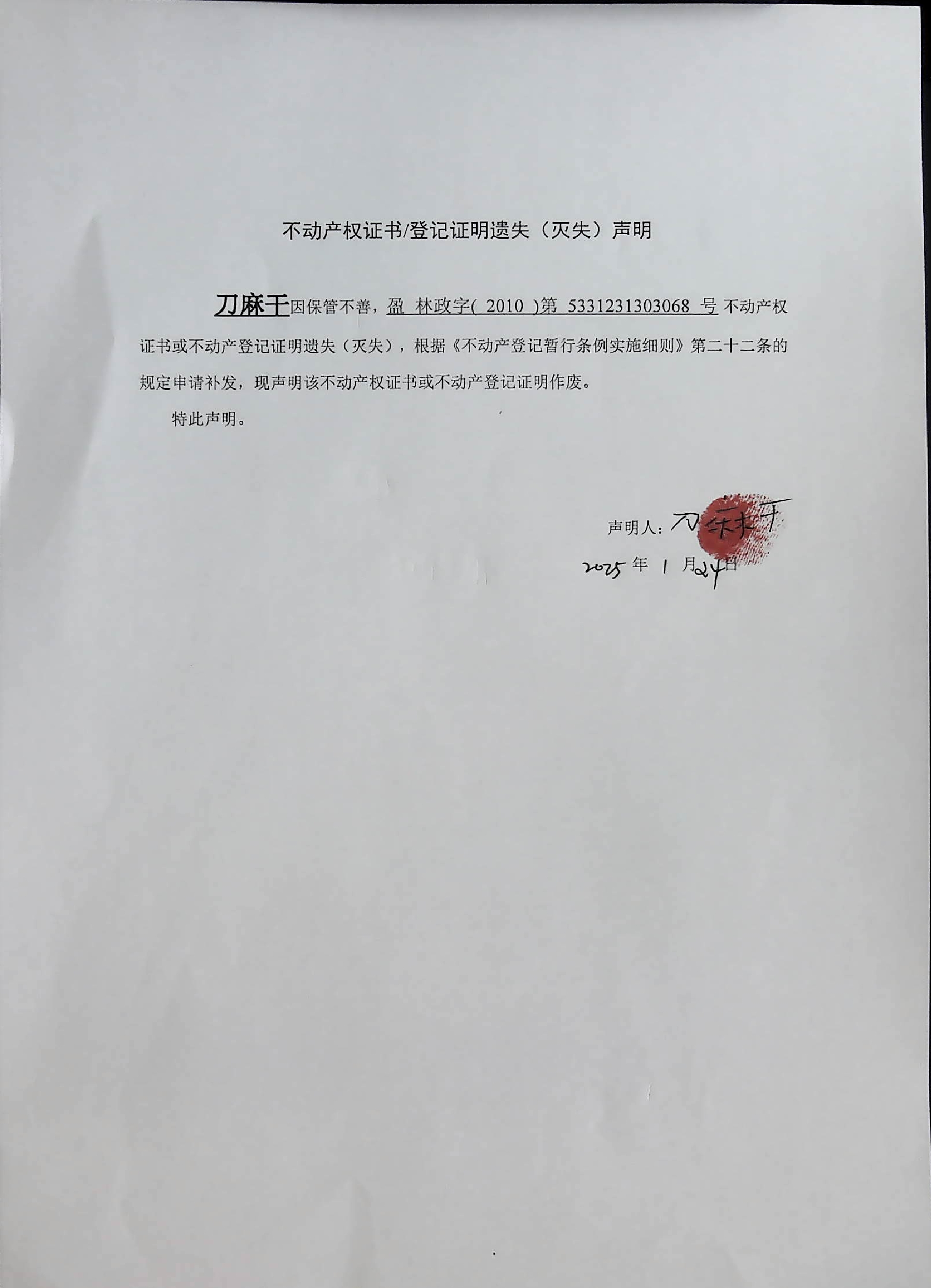 不动产权证书/登记证明遗失(灭失)声明(刀麻干)