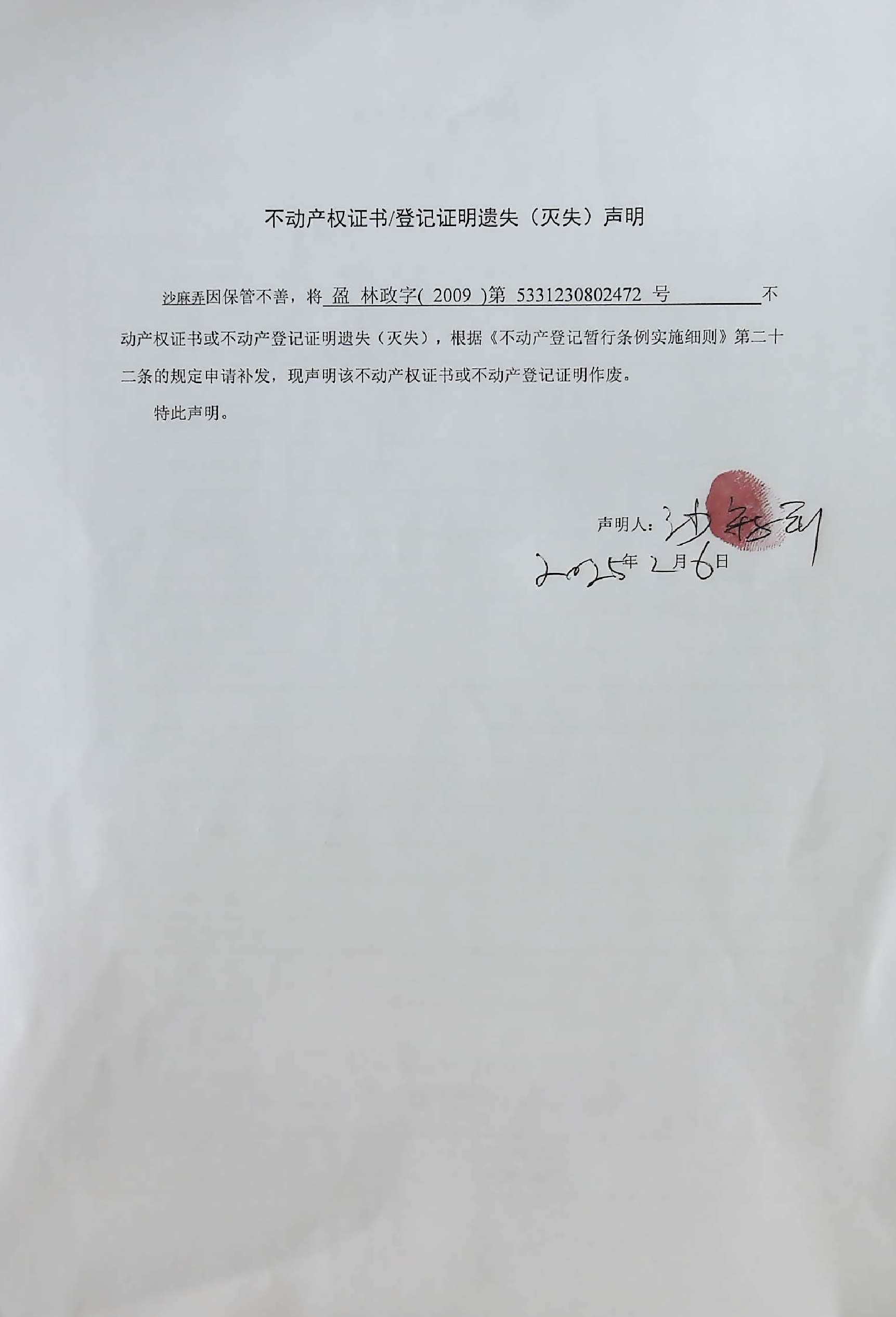 不动产权证书/登记证明遗失(灭失)声明(沙麻弄)