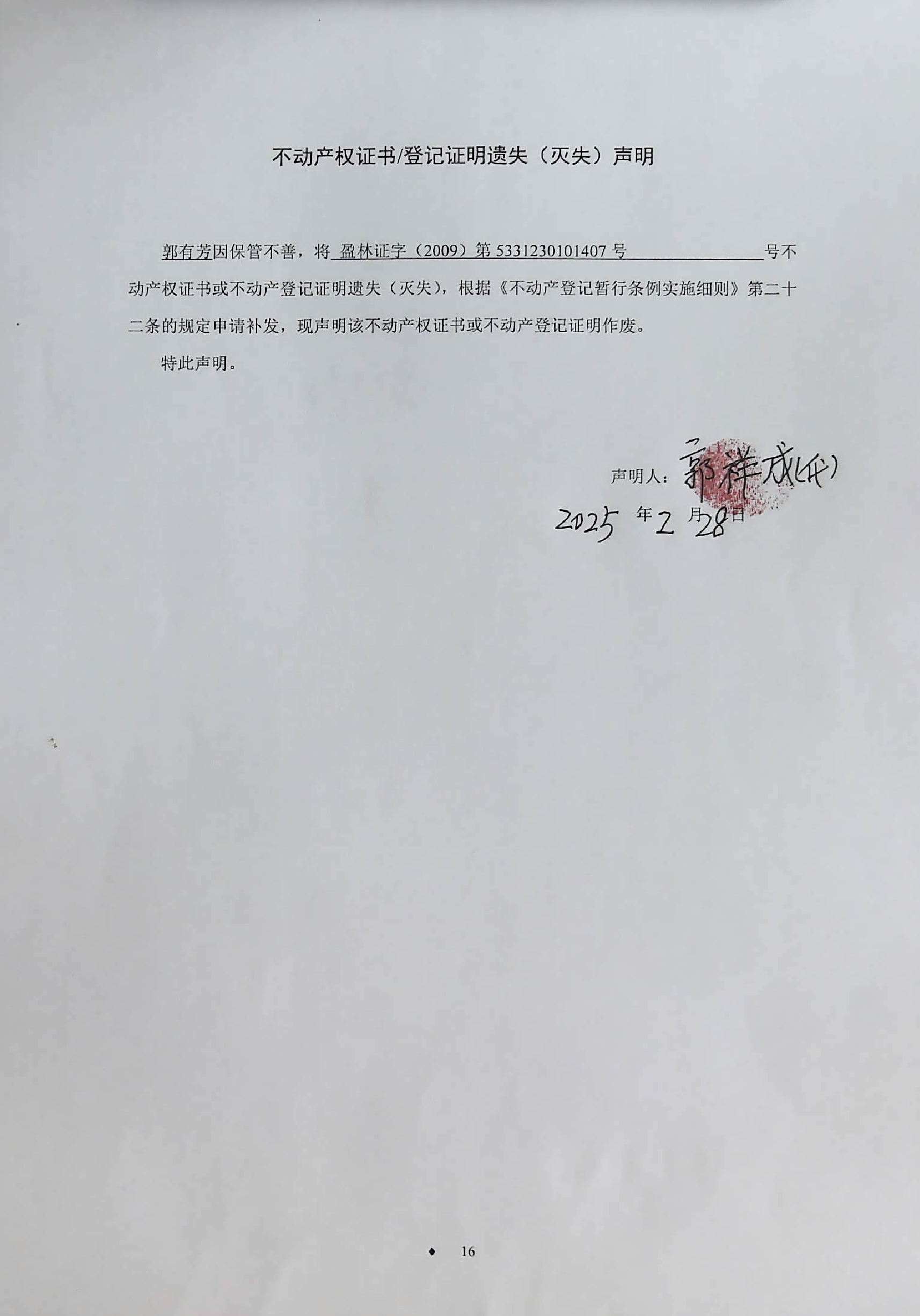 不动产权证书/登记证明遗失(灭失)声明(郭有芳)
