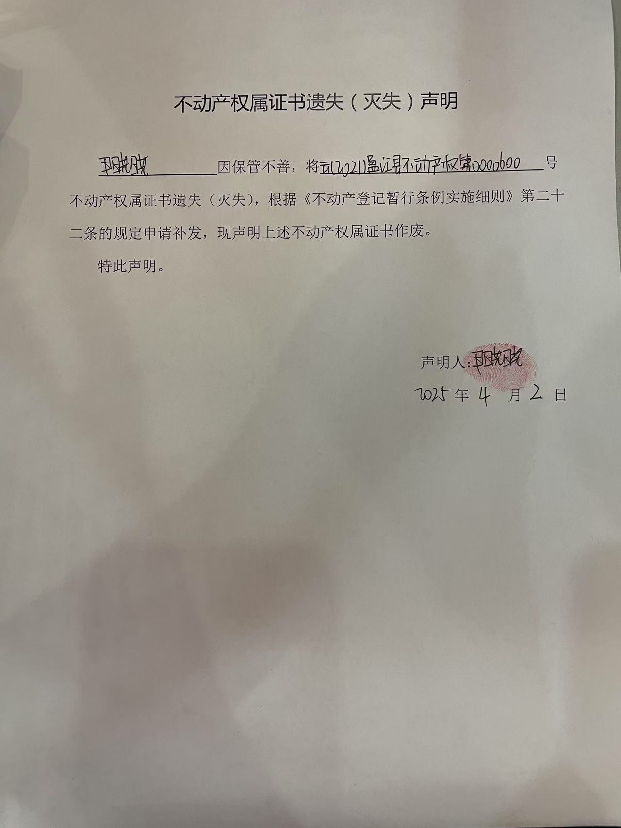 不动产权证书/登记证明遗失(灭失)声明(荣努崩)