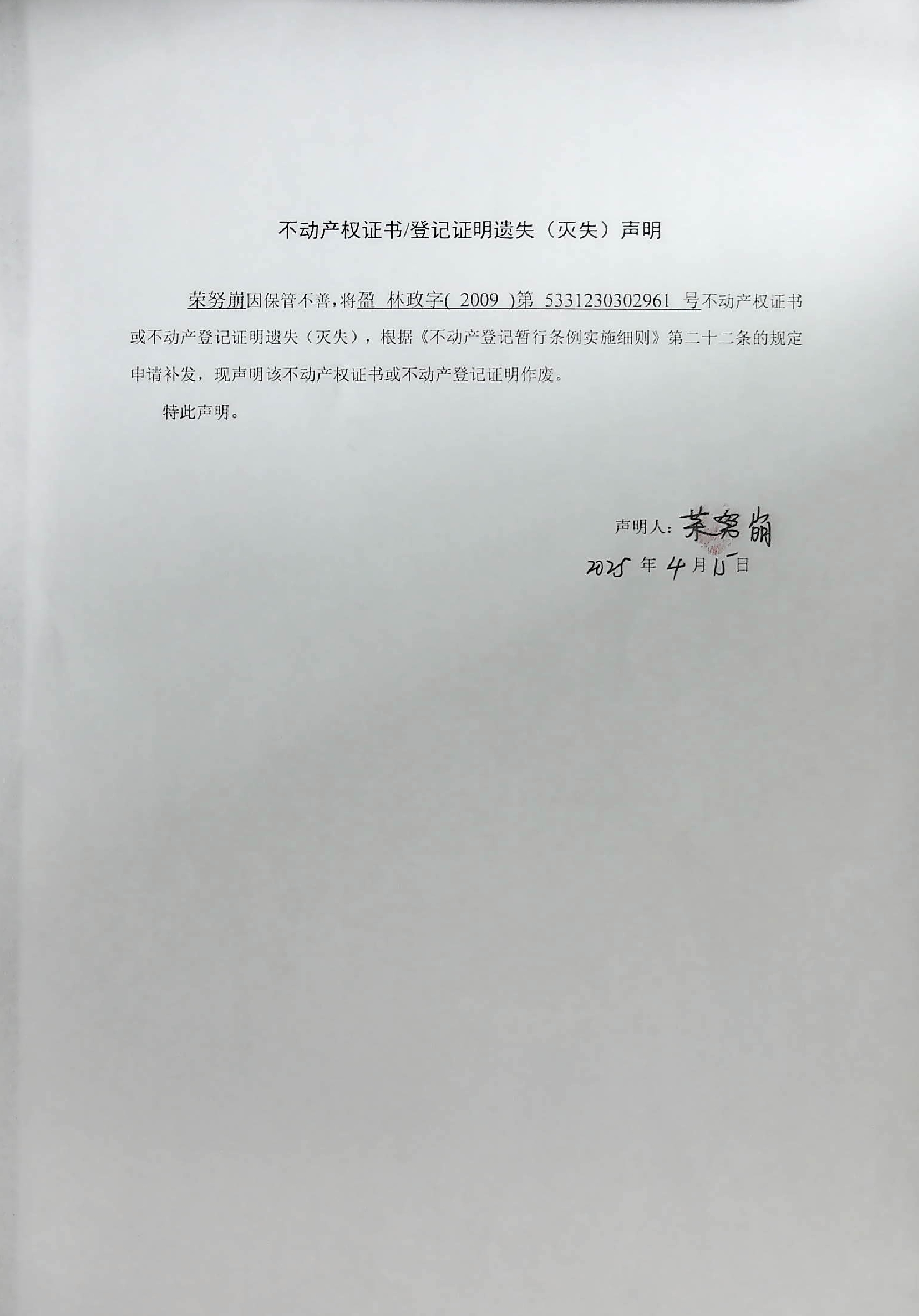不动产权证书/登记证明遗失(灭失)声明(荣努崩)