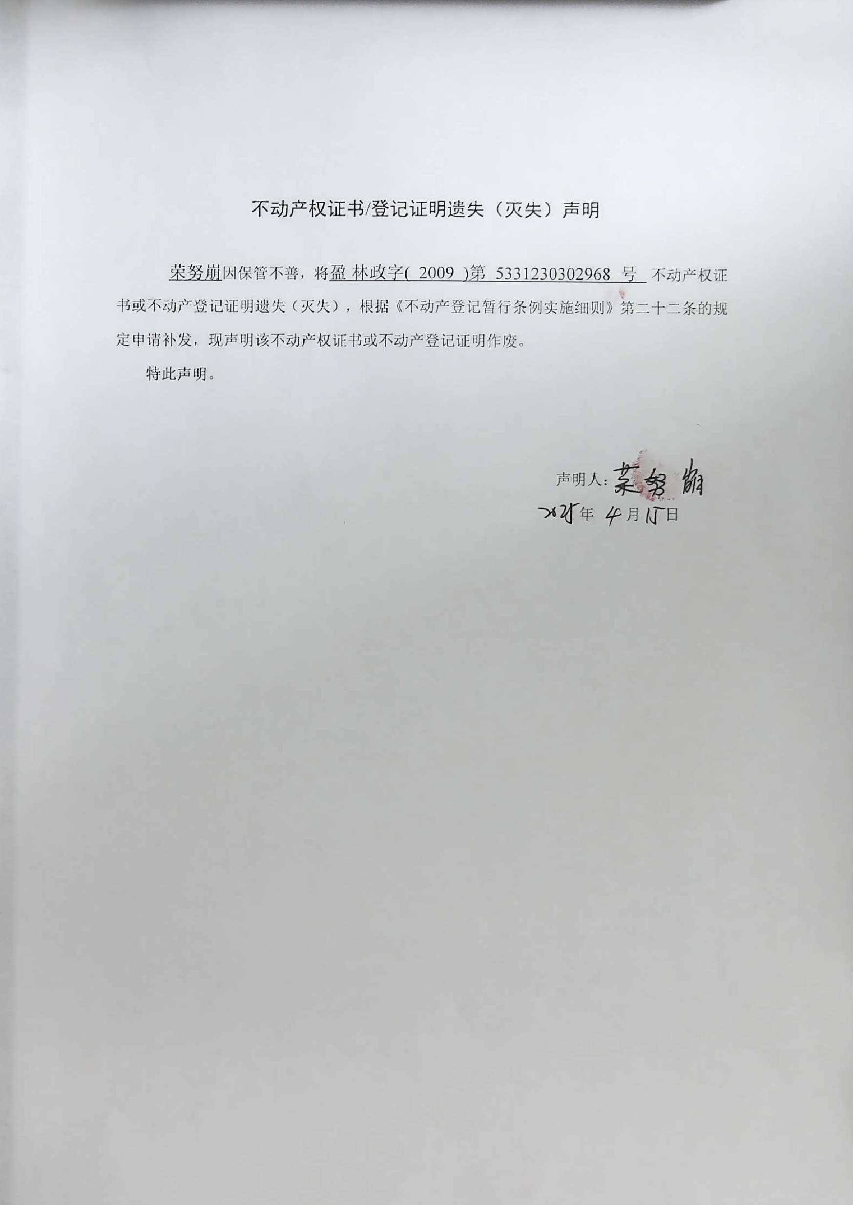 不动产权证书/登记证明遗失(灭失)声明(荣努崩)