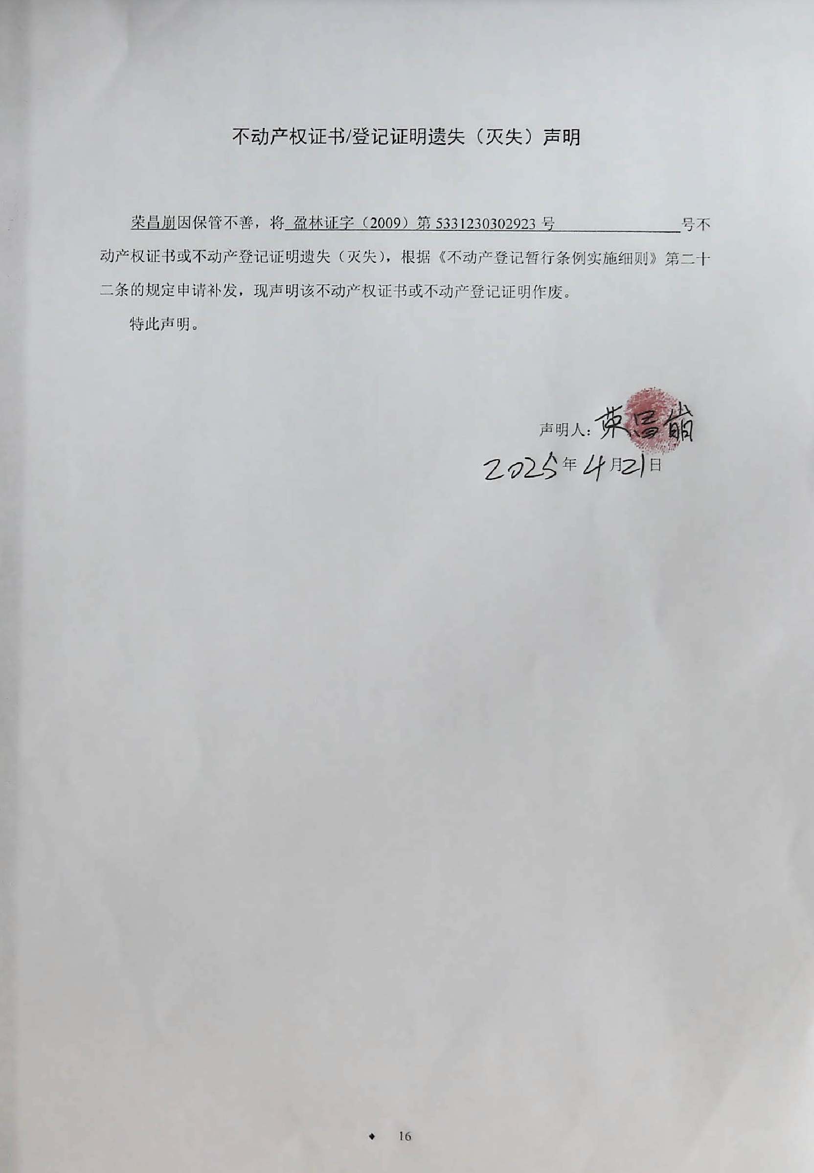不动产权证书/登记证明遗失(灭失)声明(荣昌崩)
