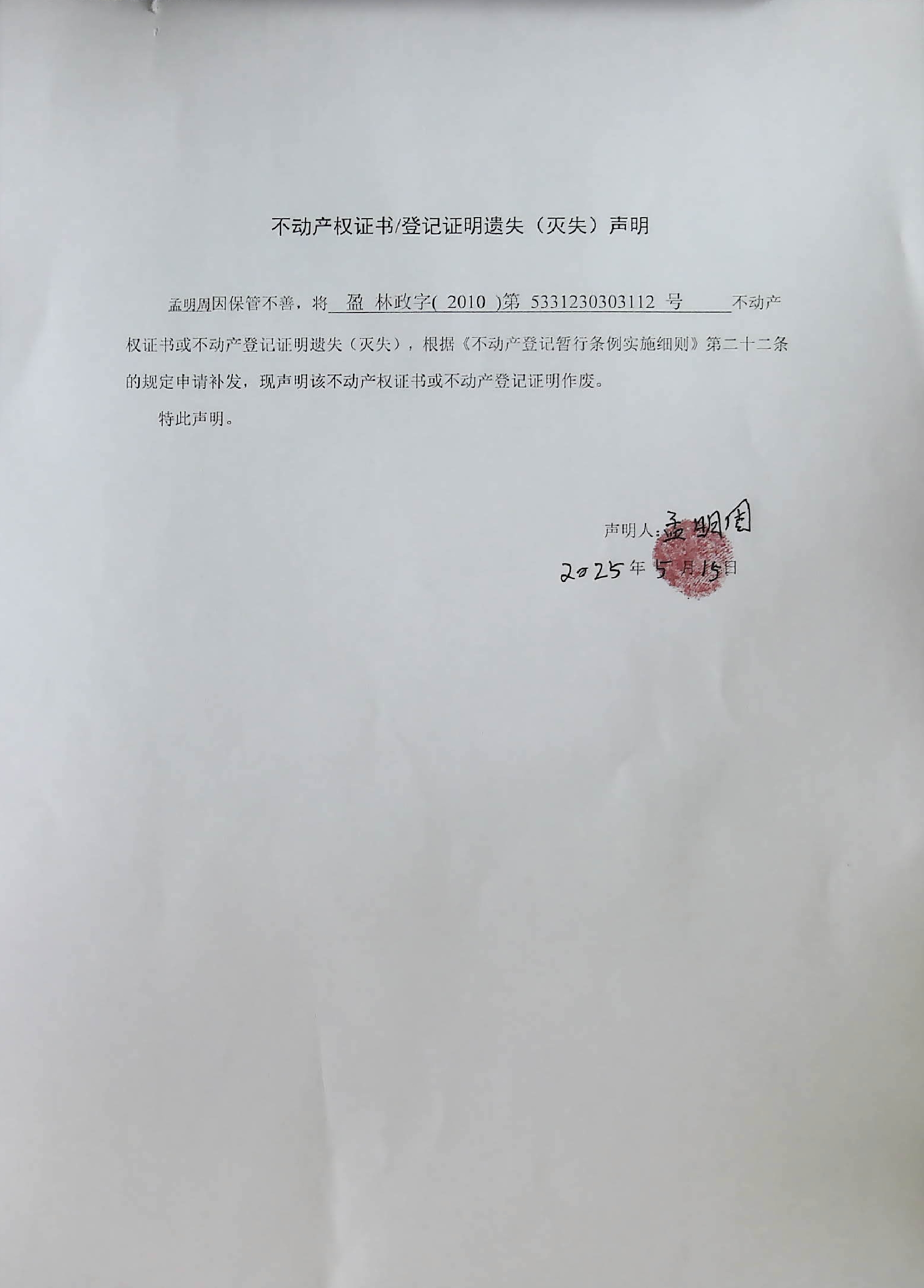 不动产权证书/登记证明遗失(灭失)声明(孟明周)
