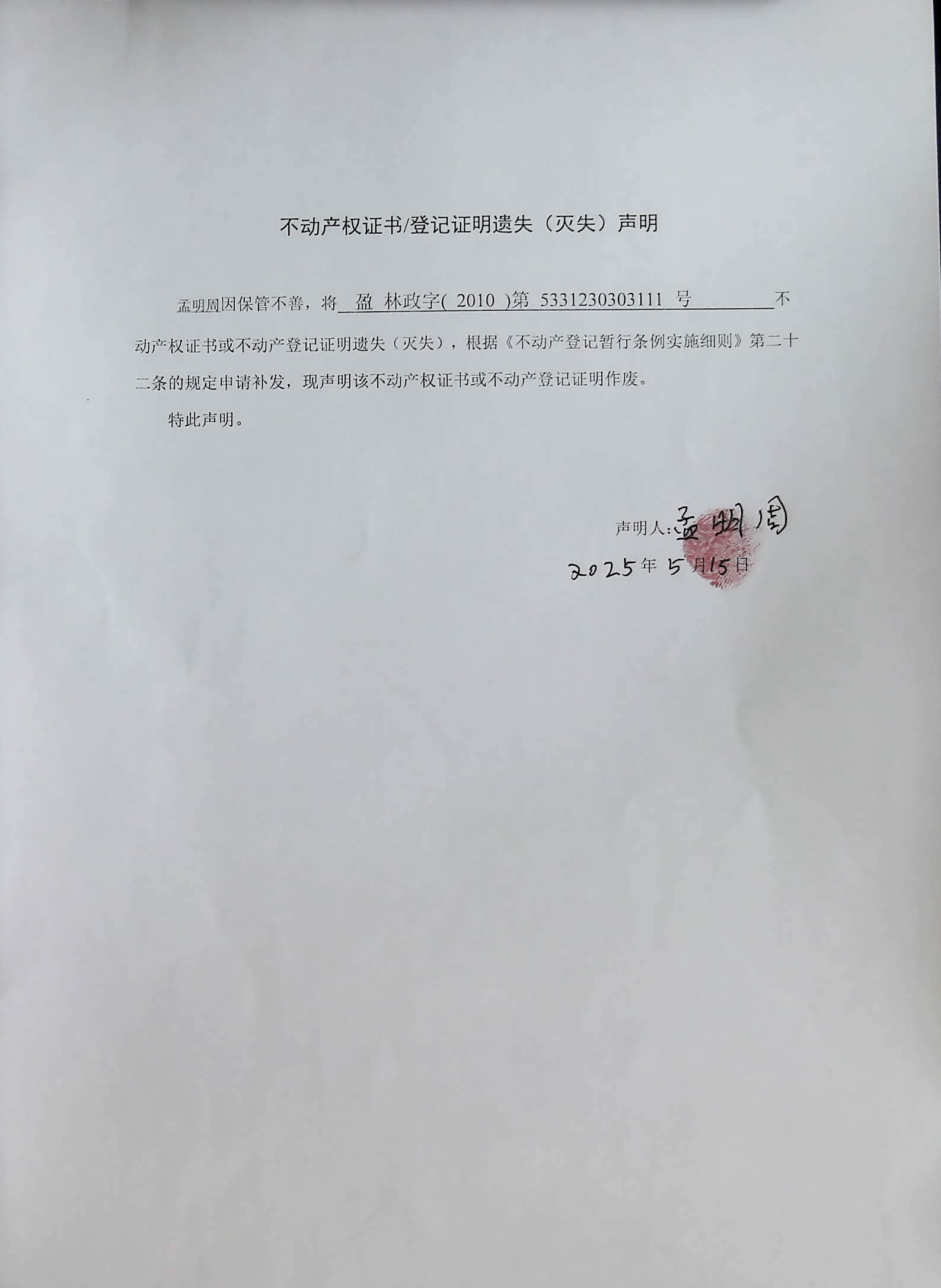 不动产权证书/登记证明遗失(灭失)声明(孟明周)