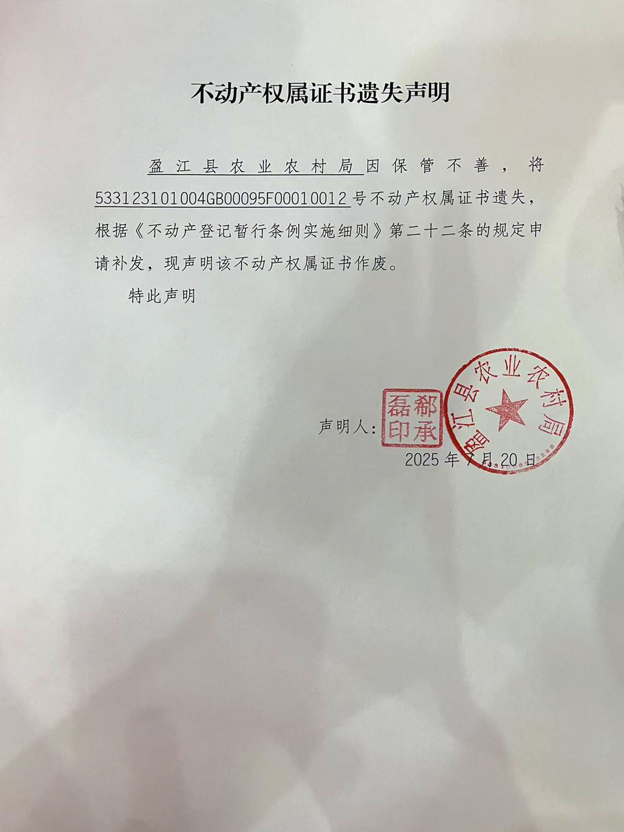 不动产权证书/登记证明遗失(灭失)声明(张生明)