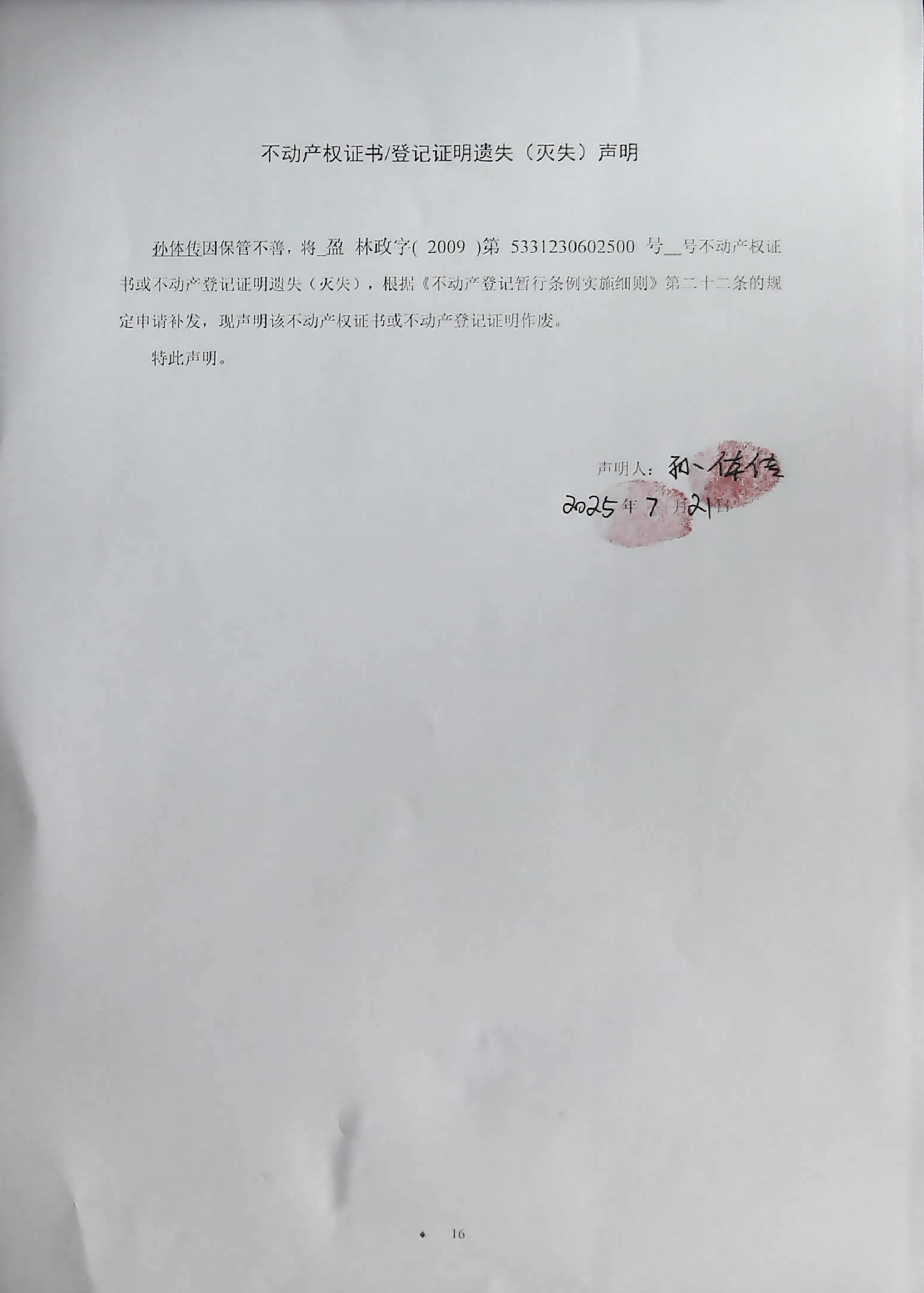 不动产权证书/登记证明遗失(灭失)声明(孙体传)