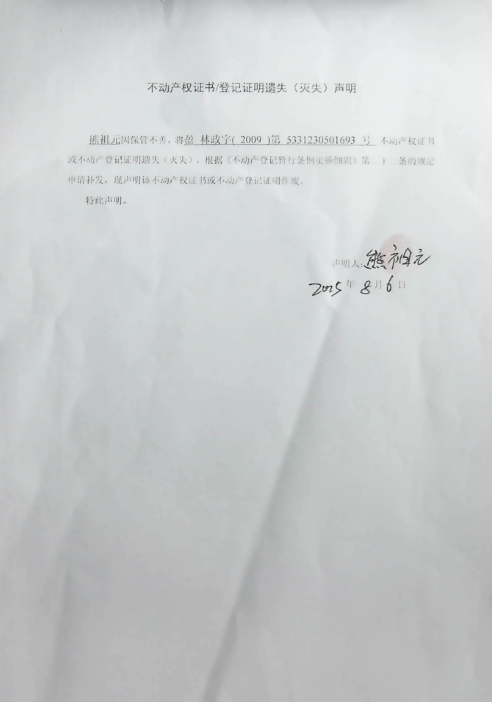 不动产权证书/登记证明遗失(灭失)声明(熊祖元)
