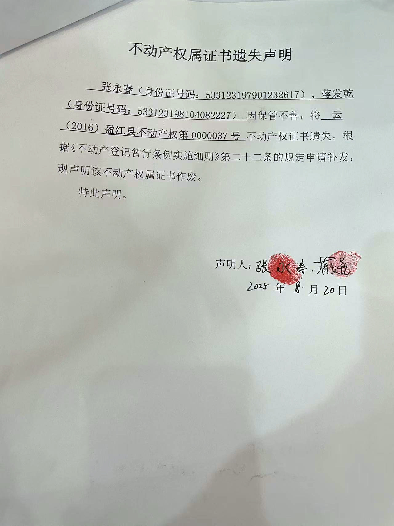 不动产权证书/登记证明遗失(灭失)声明(张永春)