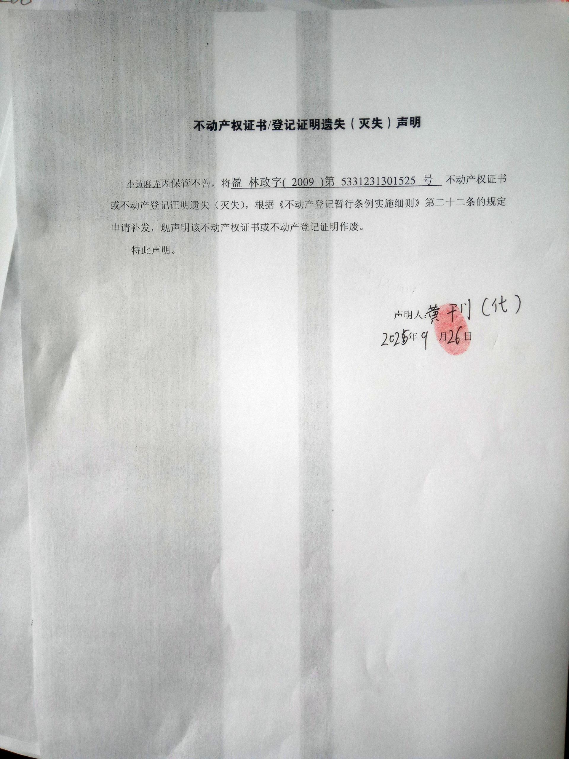 不动产权属证书遗失(灭失)声明(小黄麻弄)