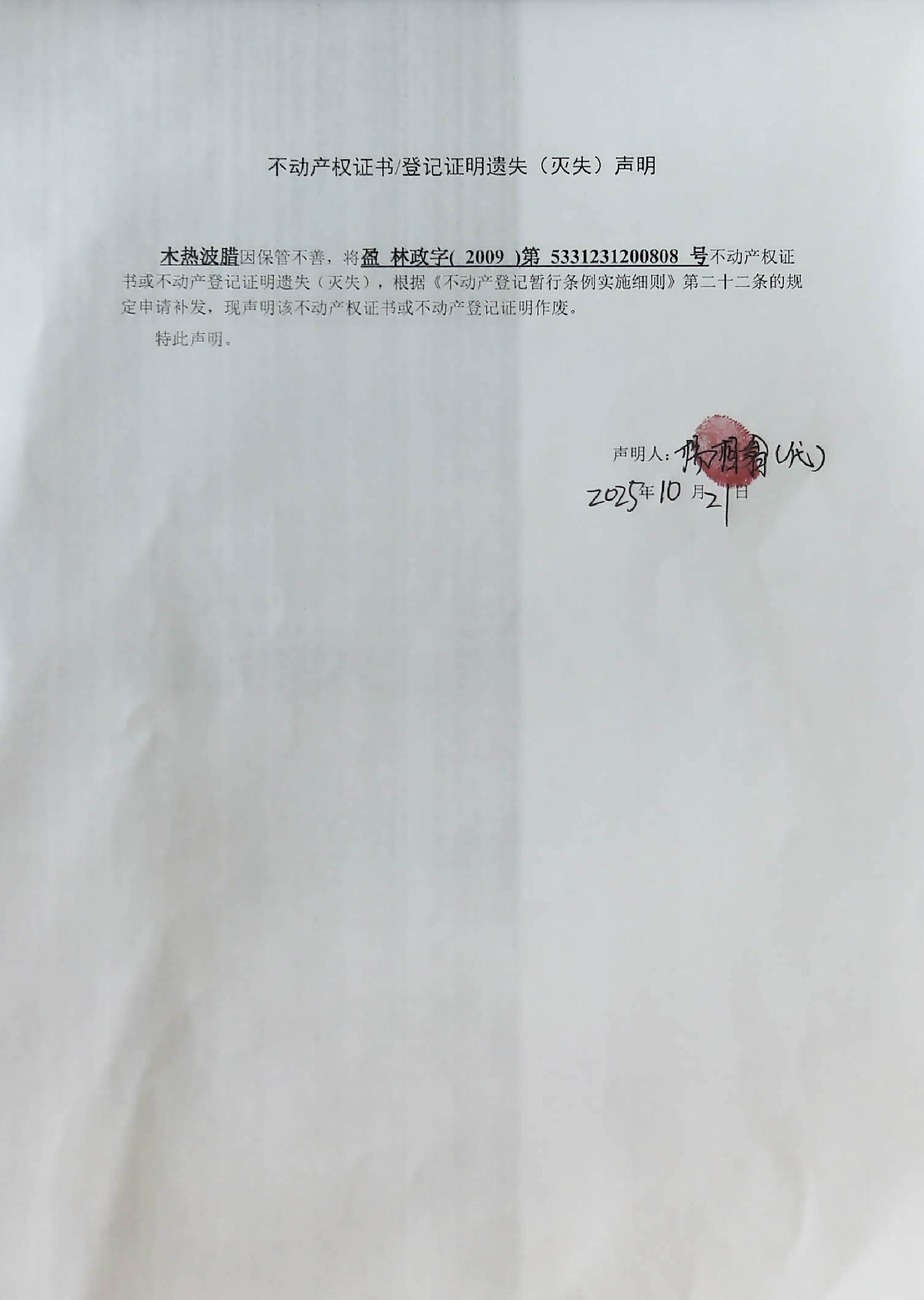 不动产证书/登记证明遗失(灭失)声明(木热波腊)