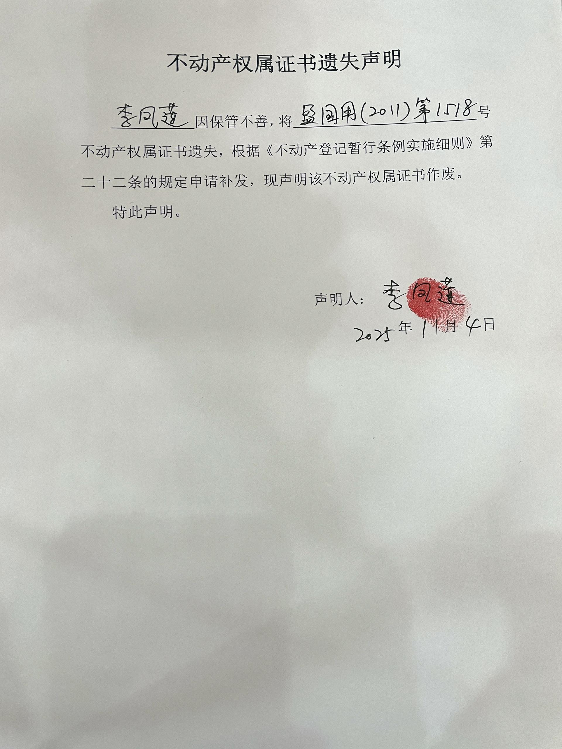 不动产权属证书遗失声明(李凤莲)