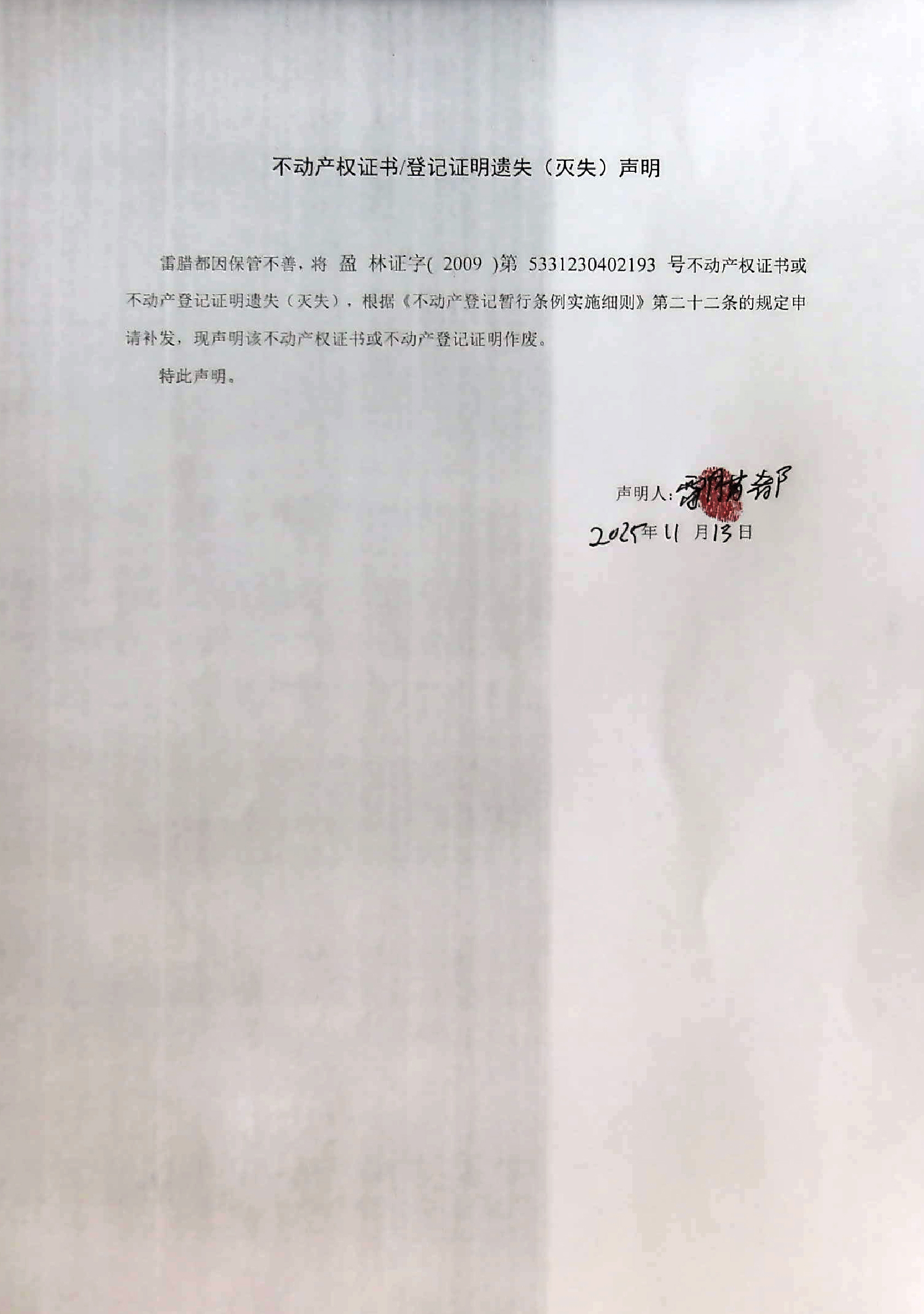 不动产证书/登记证明遗失(灭失)声明(雷腊都)