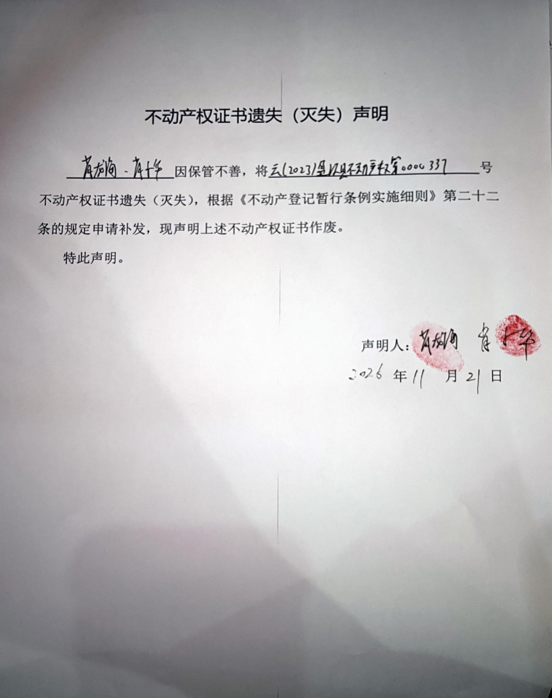 不动产登记证明遗失(灭失)声明(肖龙海、肖小华)